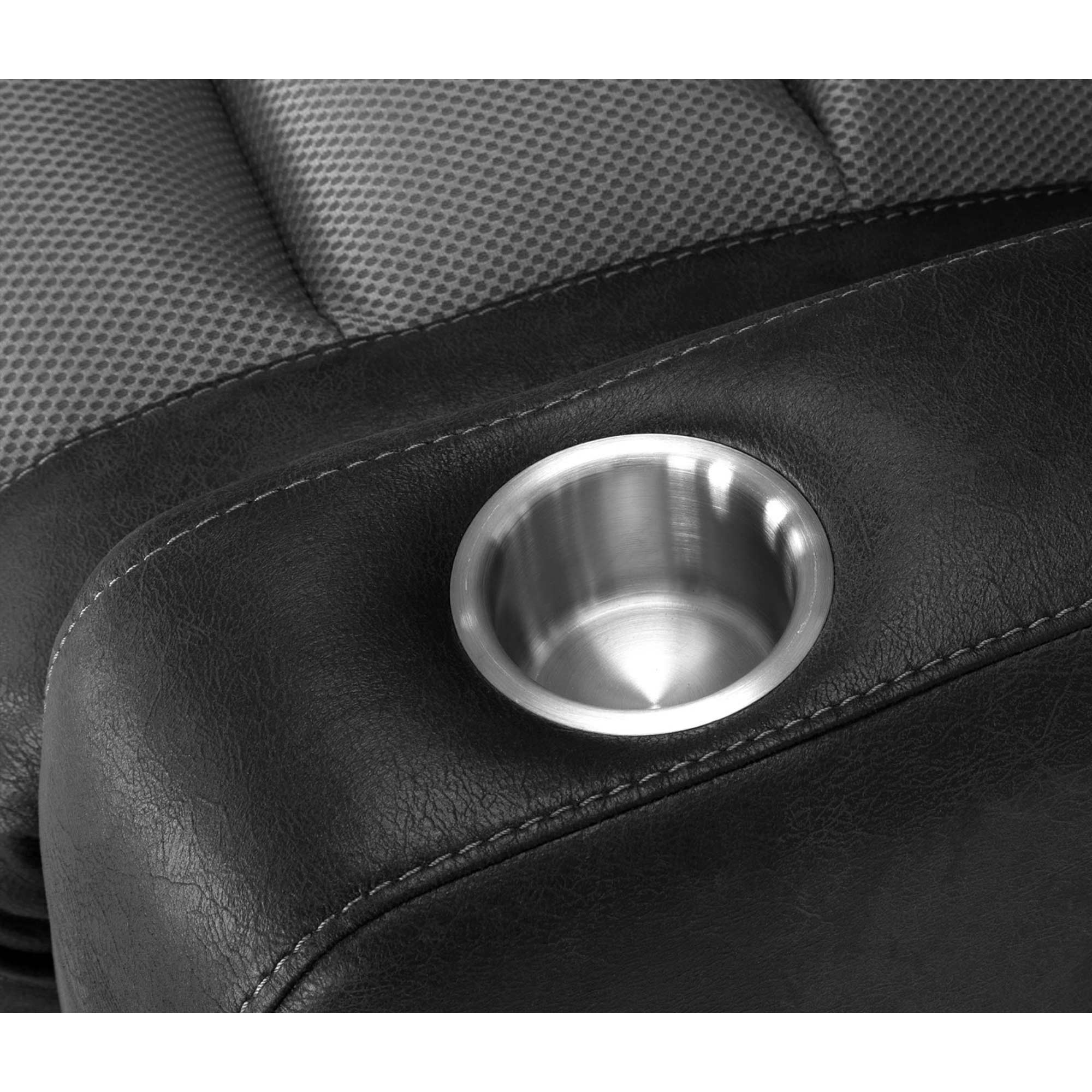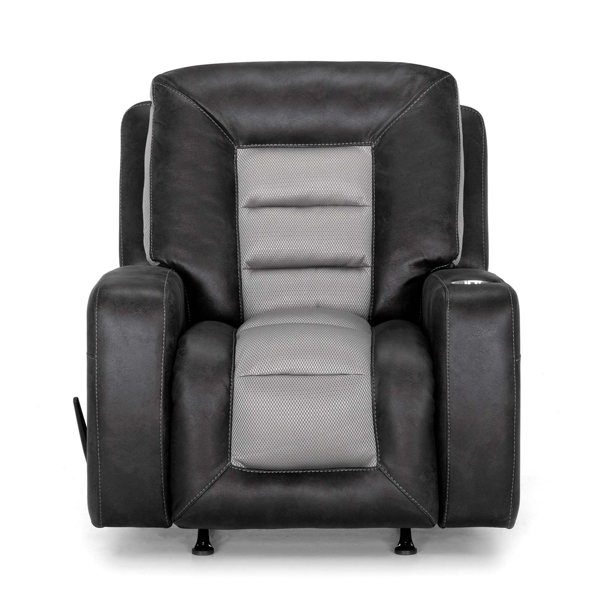 Experience breakthrough comfort with the gray and black Branson rocker recliner's innovative air-flow technology.
