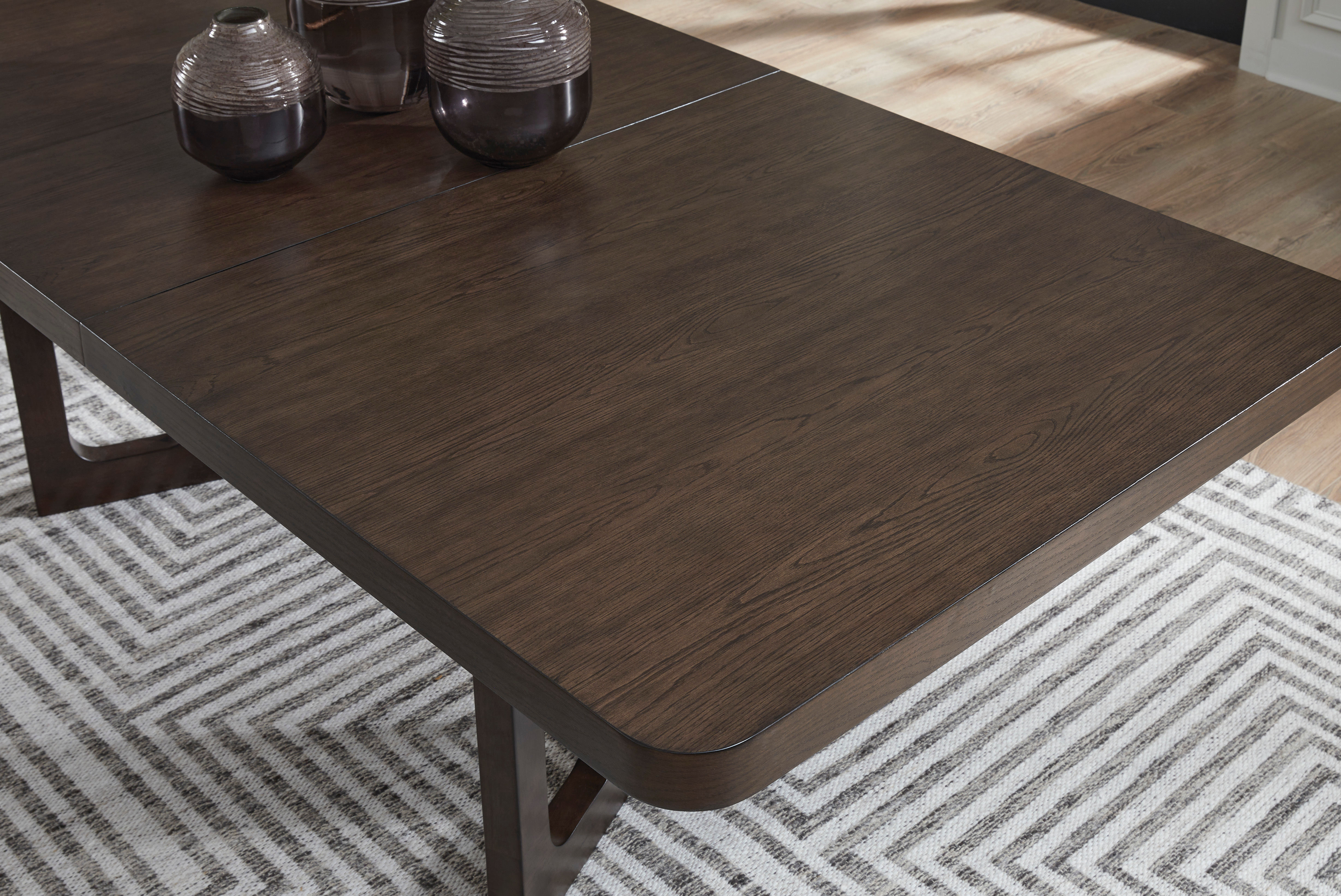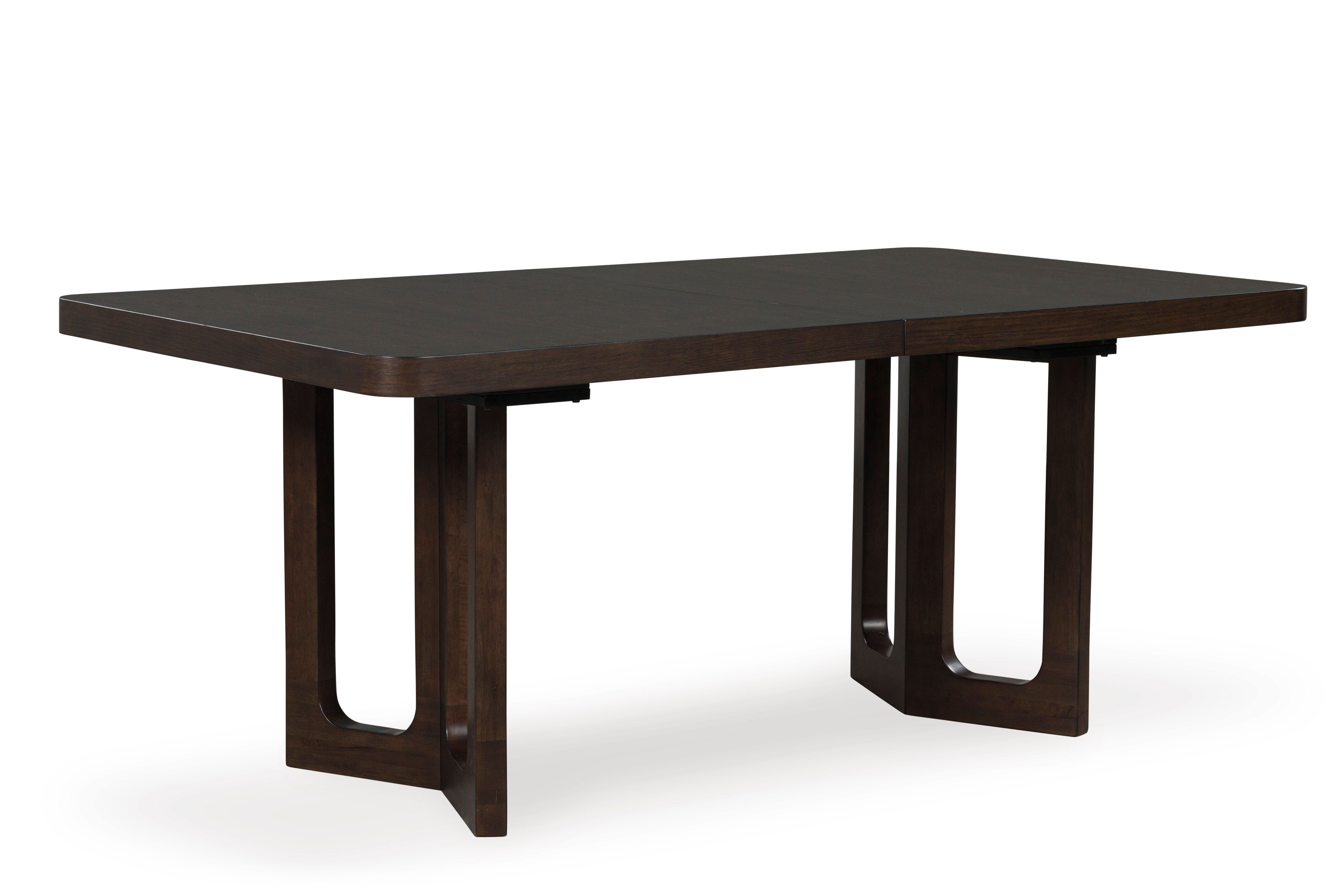 If casual contemporary style is your thing, then you'll love this dining extension table. Its wood-tone finish with a rich, dark grain contrast lends a soothing sensibility, while the sleek and stylish geometric double pedestal base infuses a dash of modern flavor you're sure to savor. With the removable leaf, it seats eight just great.