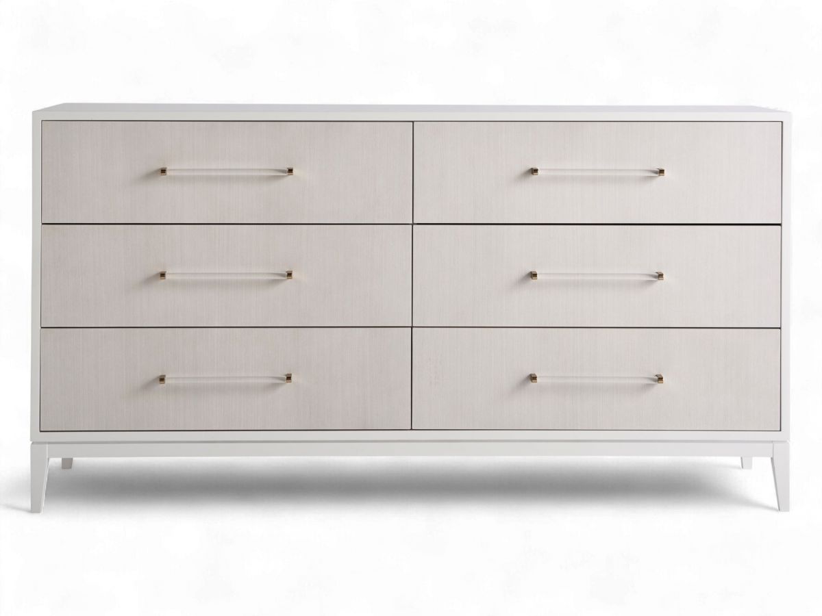 A light and airy addition to any bedroom, the Brentwood Dresser features Alabaster finished drawer fronts with champagne and acrylic bar hardware, six spacious drawers, and a gleaming white lacquer case.