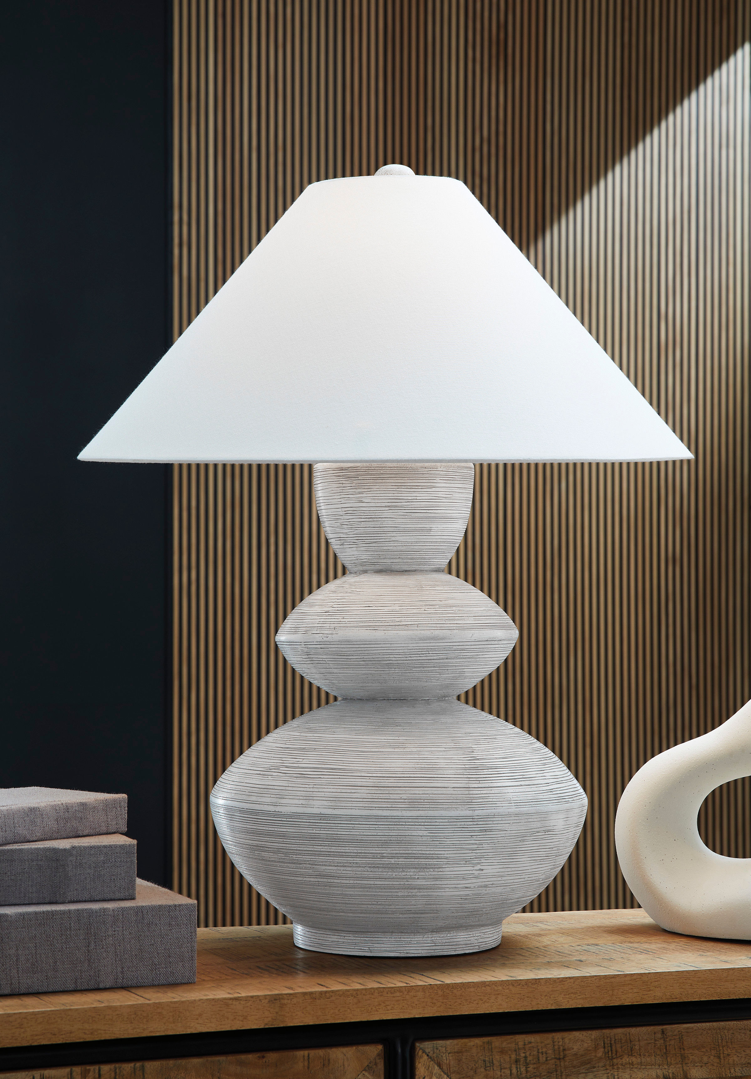 Inspired by a classic pottery form, this triple gourd table lamp lightens the mood with a sense of ease and organic style. A distressed white finish adds a layer of interest to the base. Use it in pairs for double the impact in a bedroom, living area or entryway.