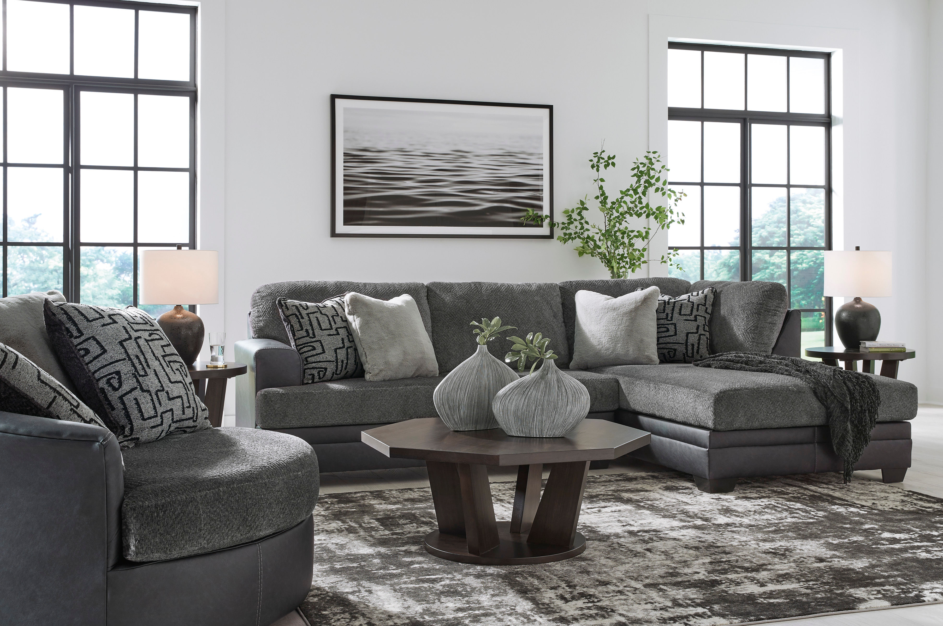 Appeal to your eye for ultra-contemporary design with this oversized swivel chair. Chic and sleek in dark neutrals, it pairs cozy fabric with faux leather for invitingly cool character. And with its robust size offering extra seating space, you can chill out in comfort and style.