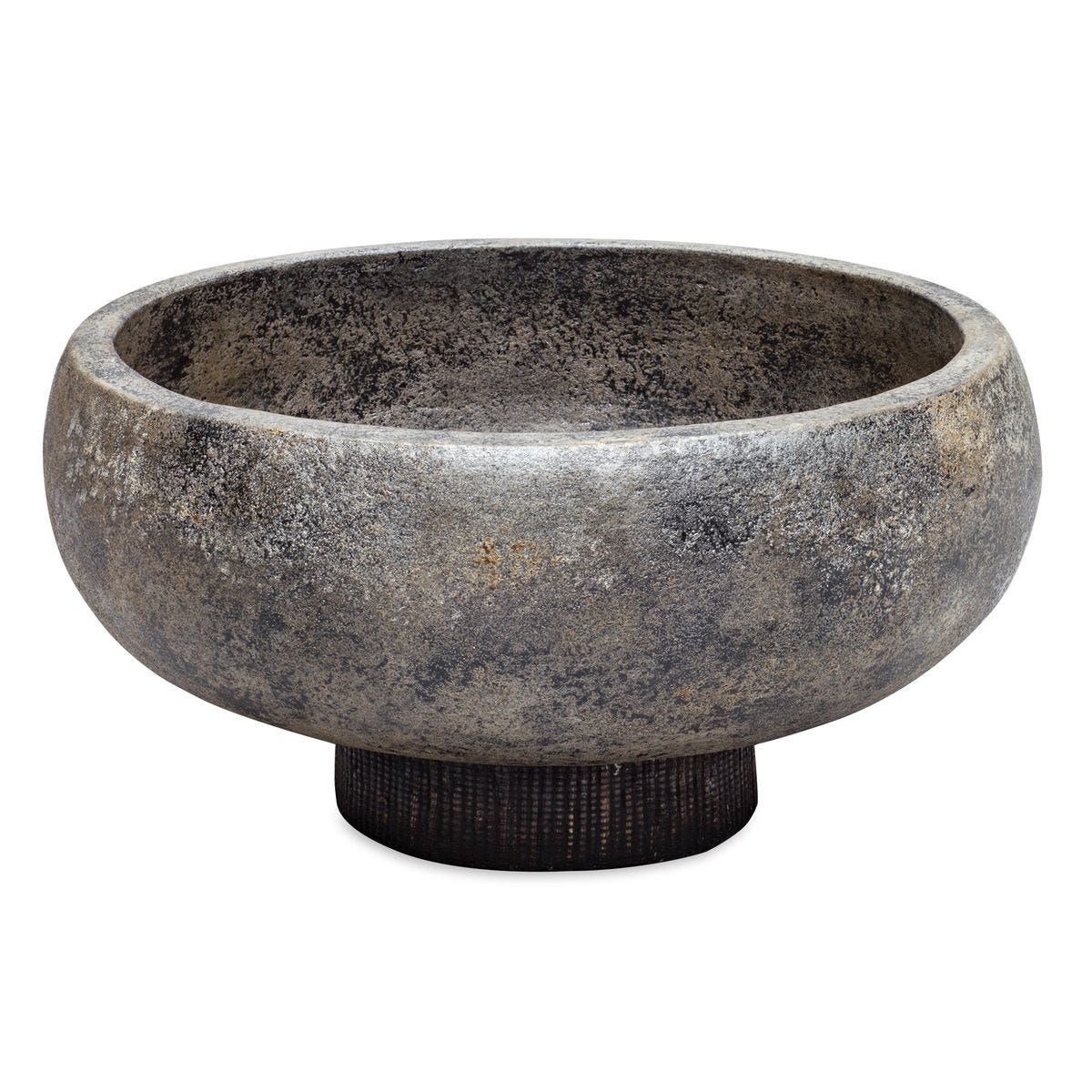 Terracotta bowl finished in an aged black with gold highlights and accented by a water hyacinth covered base.