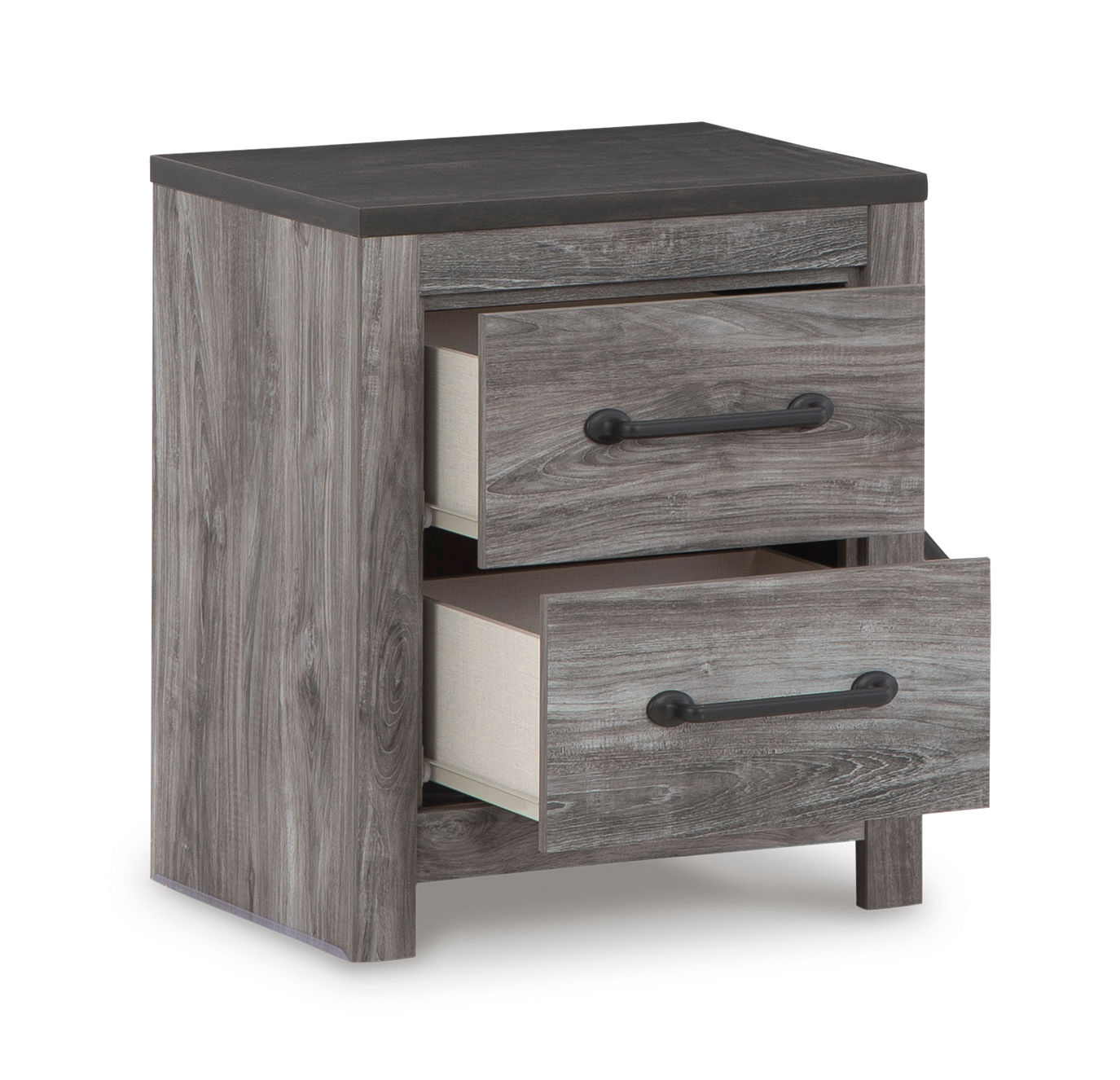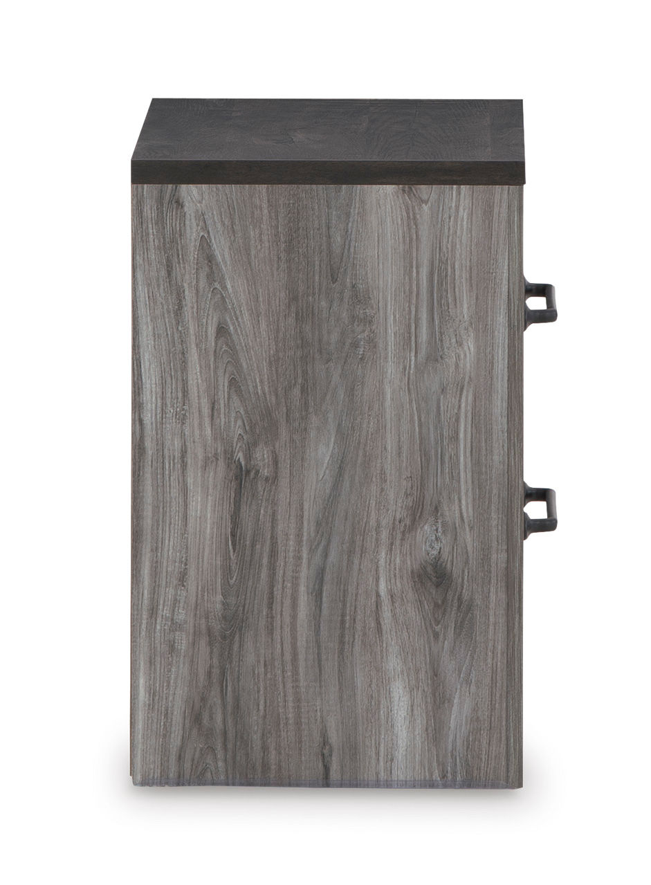 Alluring smoky gray hues create an ambiance that just feels right. The Bronyan nightstand has a charming wood-like appeal enriched by a two-tone, textured look. Light neutral shades contrasted by a dark charcoal finish bring a refined yet relaxed feel to contemporary decor and a sense of serenity to your space.