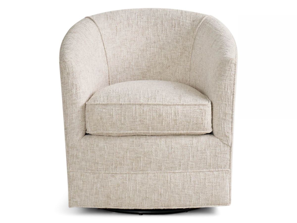 The Burke swivel chair features a modern, rounded design with a cozy, enveloping backrest and arms that create a comfortable seating experience. Upholstered in a textured, neutral beige fabric, the chair exudes a subtle elegance that can easily blend into various interior styles. The cushioned seat offers plush support, while the swivel base adds functionality and ease of movement, making it an ideal choice for both relaxation and practical use in living rooms, bedrooms, or office spaces.
