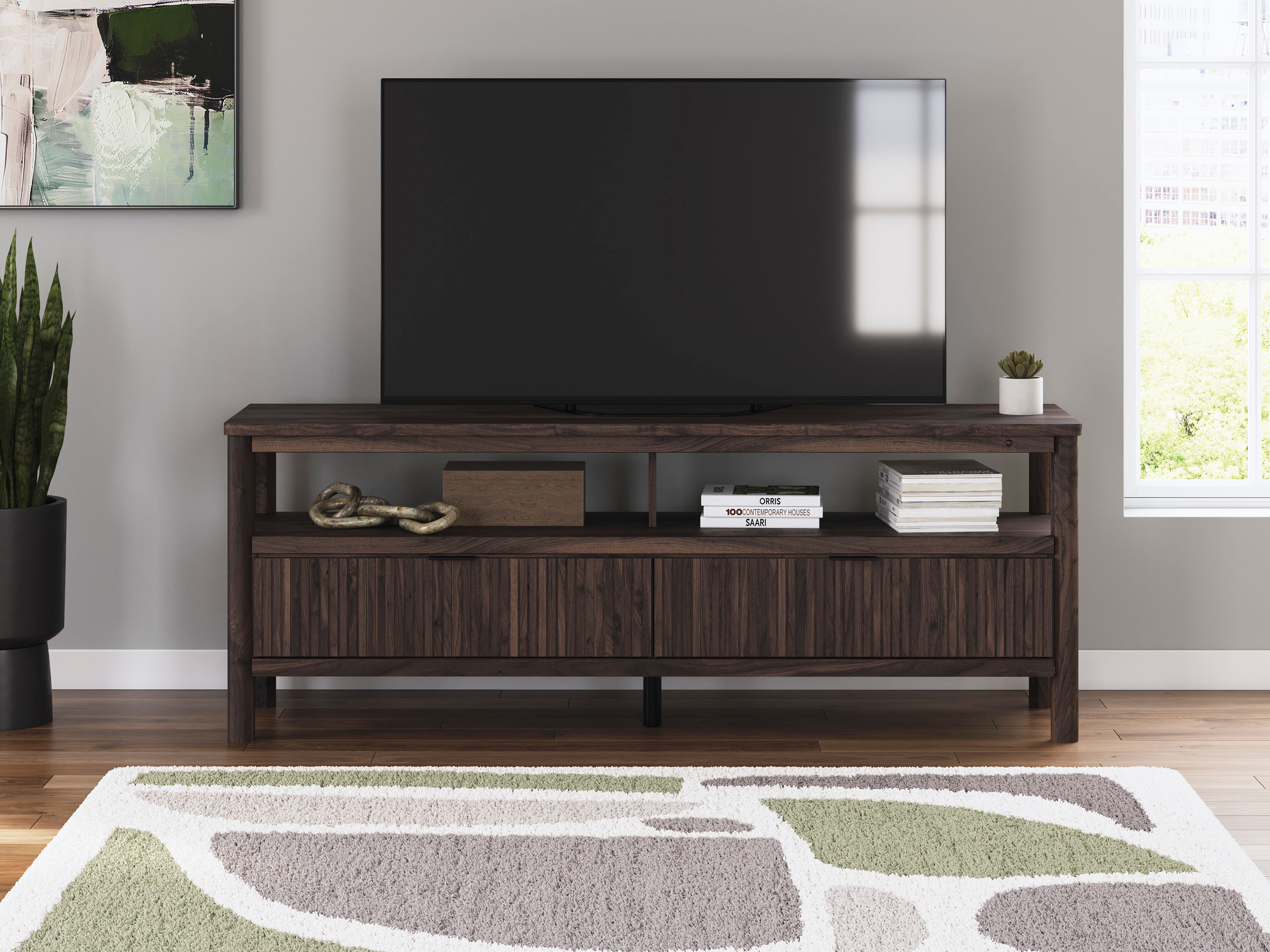 Retro-cool character meets modern boho aesthetic with the Cadmori Extra Large TV Stand in a rich brown finish.