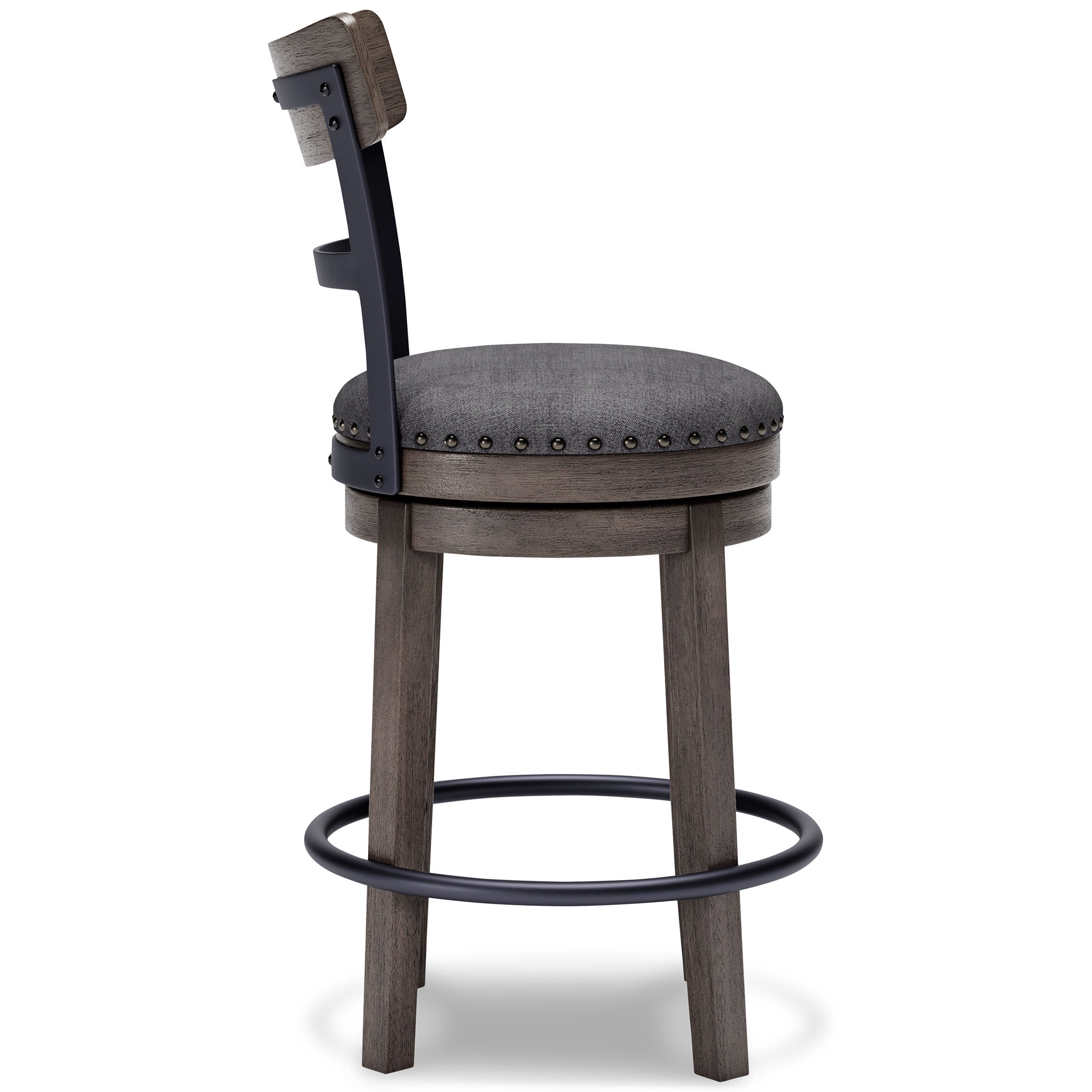 Bring a relaxed yet refined sense of good taste to a space with the Caitbrook upholstered swivel bar stool. The sturdy wood frame with contoured backrest is beautified with an antiqued gray wash finish that’s easy on the eyes. Rest assured, this bar stool caters to your comfort with a cushioned seat with gray textured fabric accentuated with nailhead trim. Sensible swivel design keeps you in the flow of conversation.