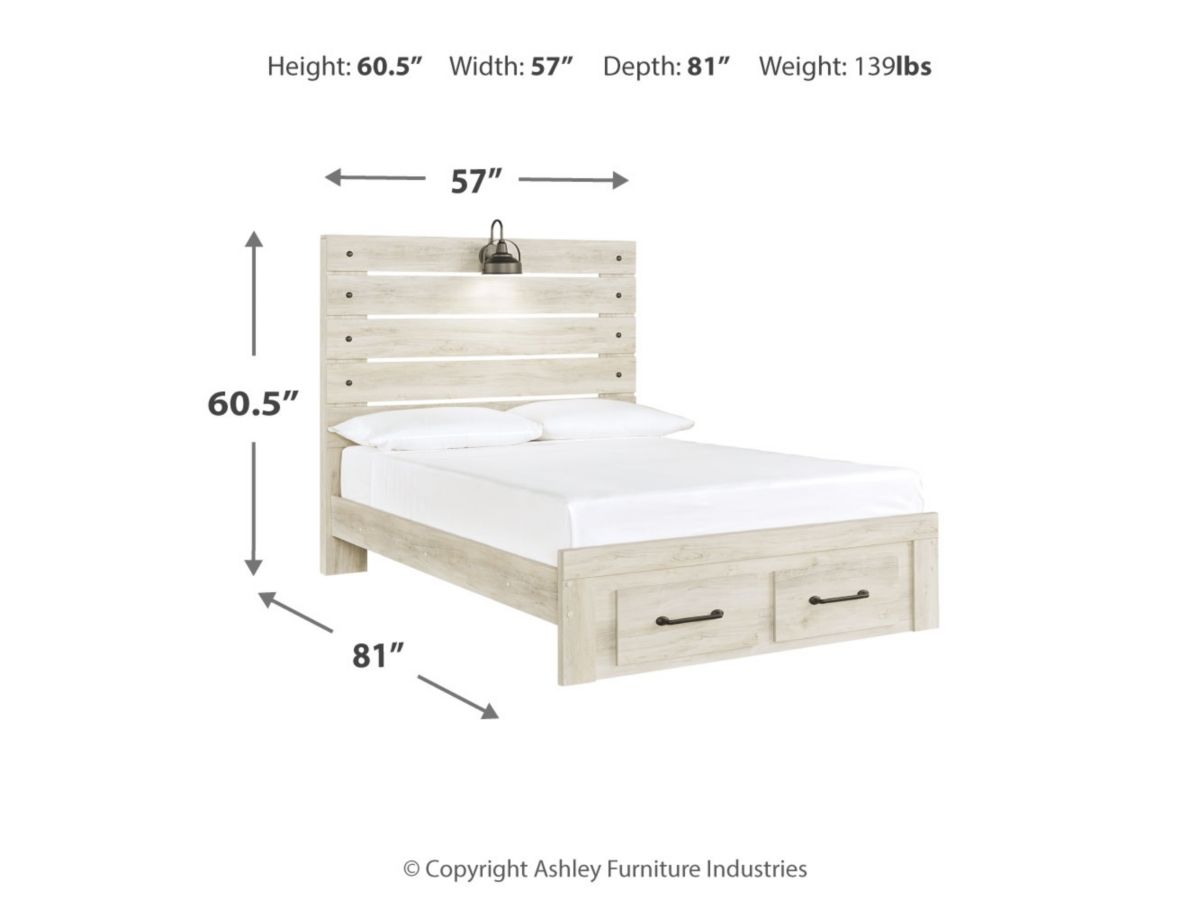What a delightful take on rustic industrial style. Whether modern loft or modern farmhouse, the Cambeck full panel bed makes itself at home. The wispy whitewash palette enhances without covering the grain for that weathered look you crave. Love to read in bed? You’re sure to find the retro-chic light sconce and USB plug-ins on the open-slat style headboard such a bright idea. Elongated drawer pulls on the footboard storage drawers elevate the aesthetic.