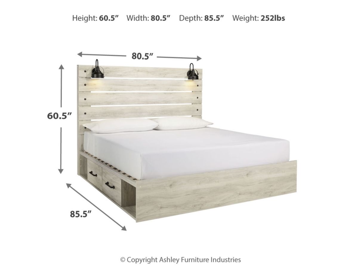 What a delightful take on rustic industrial style. Whether modern loft or modern farmhouse, the Cambeck king panel storage bed makes itself at home. The wispy whitewash palette enhances without covering the grain for that weathered look you crave. Love to read in bed? You’re sure to find the retro-chic light sconces and USB plug-ins on the open-slat style headboard such a bright idea. Elongated drawer pulls on the under bed storage drawers elevate the aesthetic.