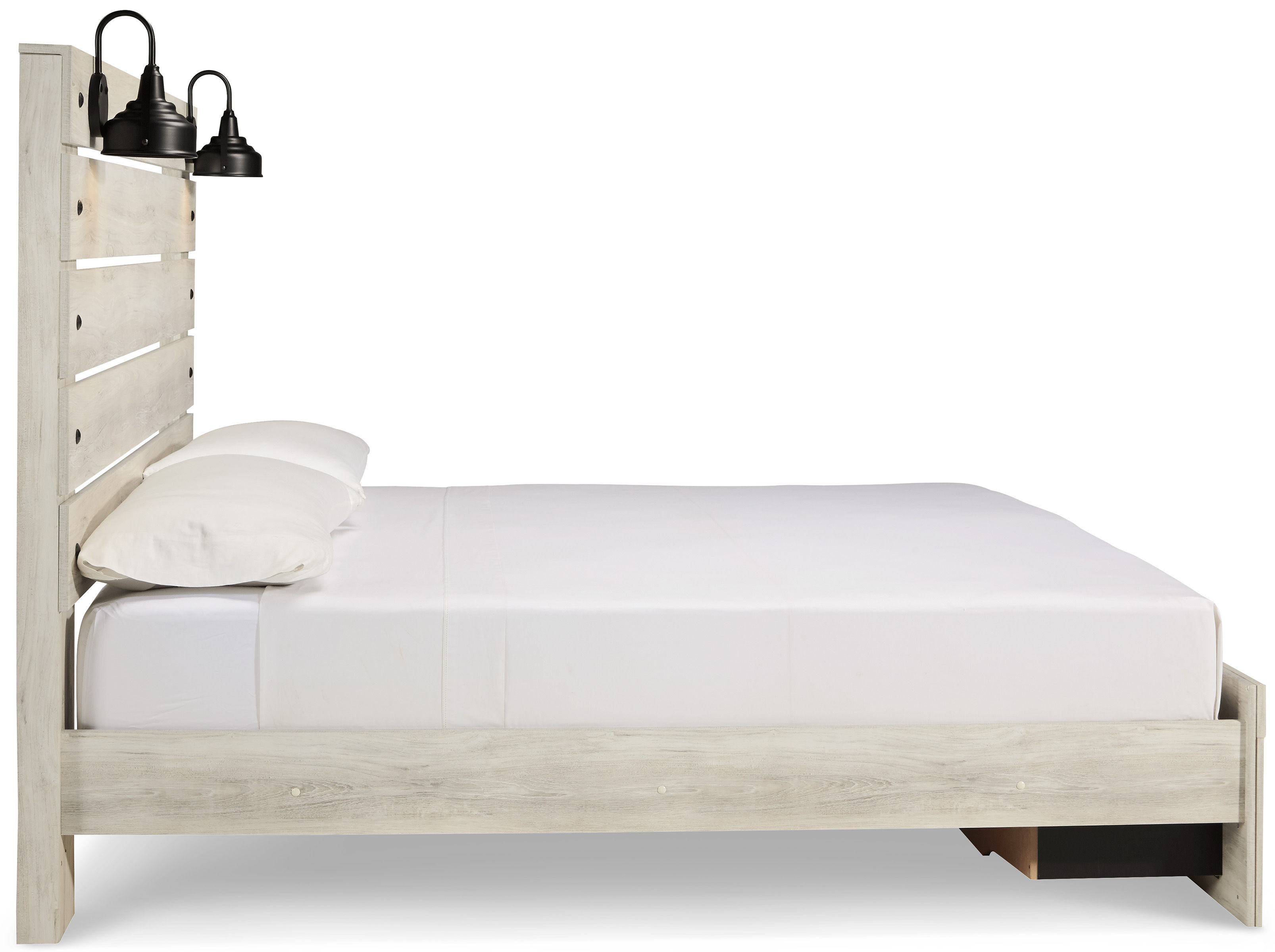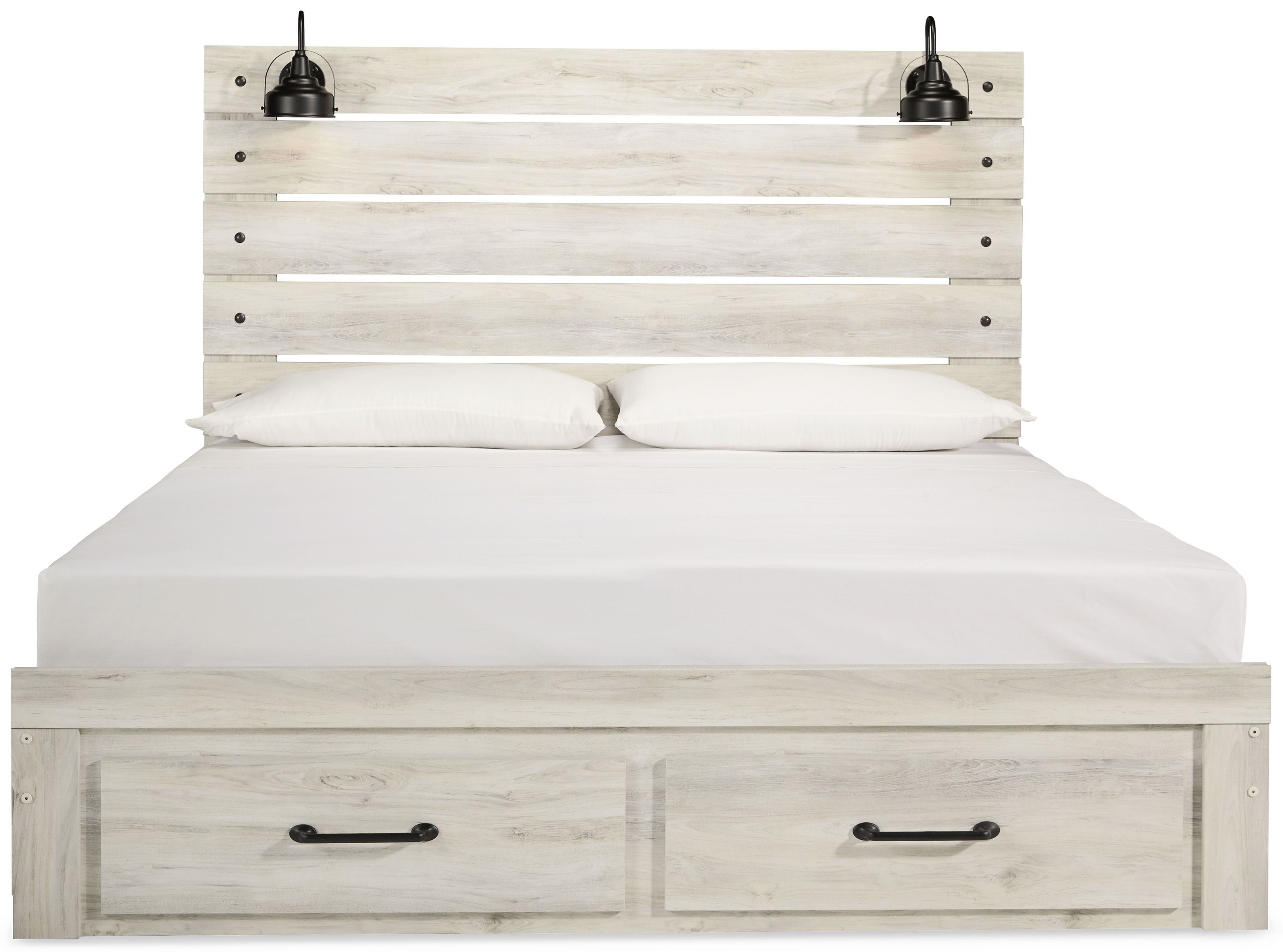 What a delightful take on rustic industrial style. Whether modern loft or modern farmhouse, the Cambeck king panel bed makes itself at home. The wispy whitewash palette enhances without covering the grain for that weathered look you crave. Love to read in bed? You’re sure to find the retro-chic light sconces and USB plug-ins on the open-slat style headboard such a bright idea.