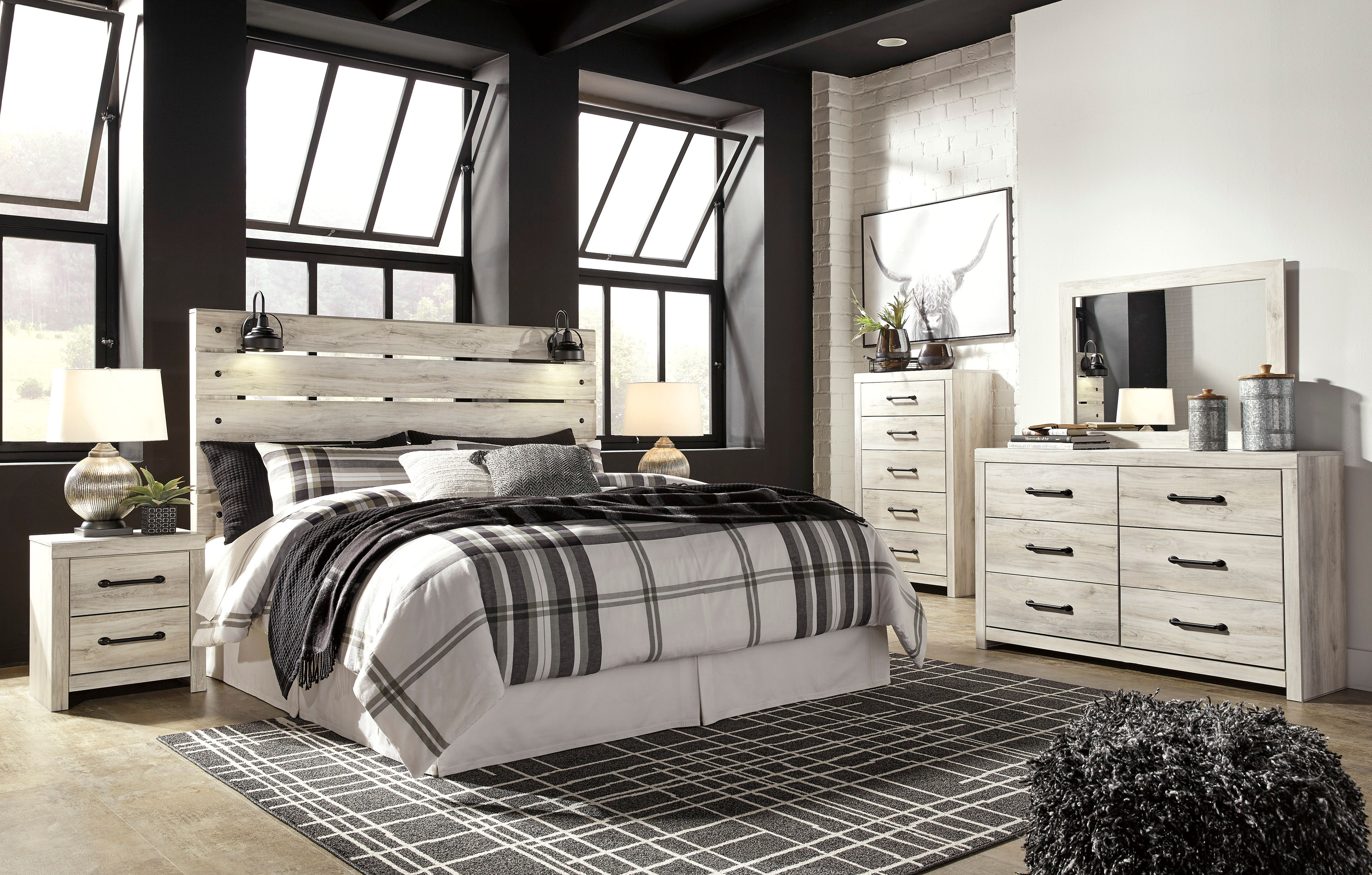 What a delightful take on rustic industrial style. Whether modern loft or modern farmhouse, the Cambeck king panel headboard makes itself at home. The wispy whitewash palette enhances without covering the grain for that weathered look you crave. Love to read in bed? You’re sure to find the retro-chic light sconces and USB plug-ins on the open-slat style headboard such a bright idea.