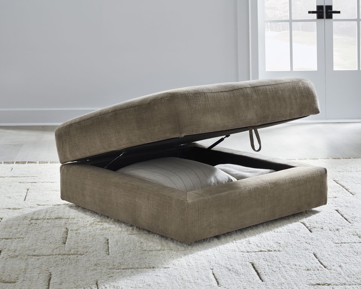 Neutral tones and casual contemporary style make the Camellia-Court storage ottoman perfect for any living room.
