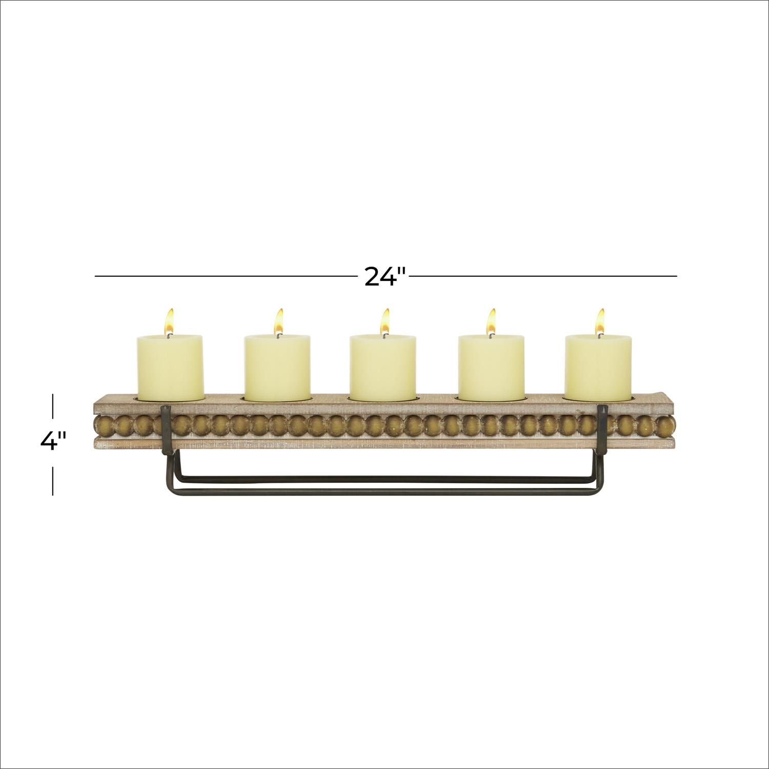 Inspired by blissful serenity and the allure of the sea, where soothing hues and natural textures bring effortless charm to the home. The brown decorative candelabra is crafted from MDF and iron for durability and longevity. The rectangle candlestick stand boasts a washed brown finish with matte black metal stands, offering a rustic yet refined aesthetic. The MDF candelabra features intricate brown bead accents and sturdy iron stands, supporting a wooden platform for five candles.