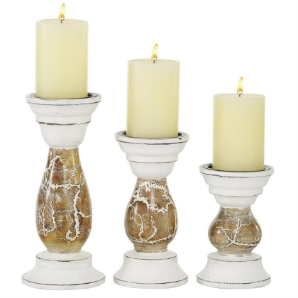 Enhance your farmhouse inspired home with classic style and a touch of cozy appeal. These candle holders are made of a solid mango wood construction. Comes in distressed beige bodies along with white platforms and bases. Features wooden pillar candle holders in varying heights, comes in distressed beige bodies along with white platforms and bases.