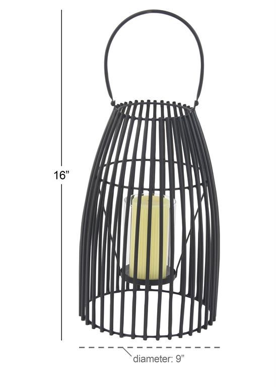 • Matte black lantern candle holder decor features a round shape with a vertical slat pattern and open-ended inverted cone shape, and arched handle for visual interest