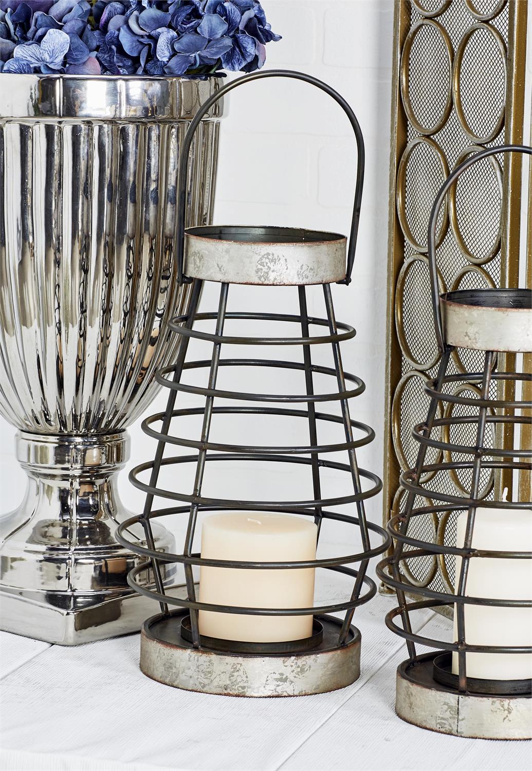 • Pear-shaped candle lantern with horizontal metal rings held by four vertical wires