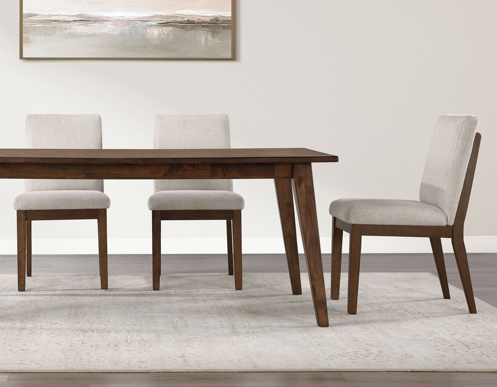 Elegantly casual style arrives in the dining room with the Canton 5-Piece 72″ Upholstered Side Chair Dining Set. Influenced by mid-century modern design and ready to seat up to six, this set showcases a beautiful butcher block top layup and tapered solid wood legs, exuding both elegance and warmth. Crafted from solid mango and Asian hardwoods, it ensures lasting durability. The hand-stained multi-step brown cherry finish highlights the natural grain, while the oatmeal-colored cushioned chair offers a comfortable, stain-resistant surface. Ideal for intimate gatherings, this versatile set combines timeless aesthetics with exceptional stability, making every meal memorable.