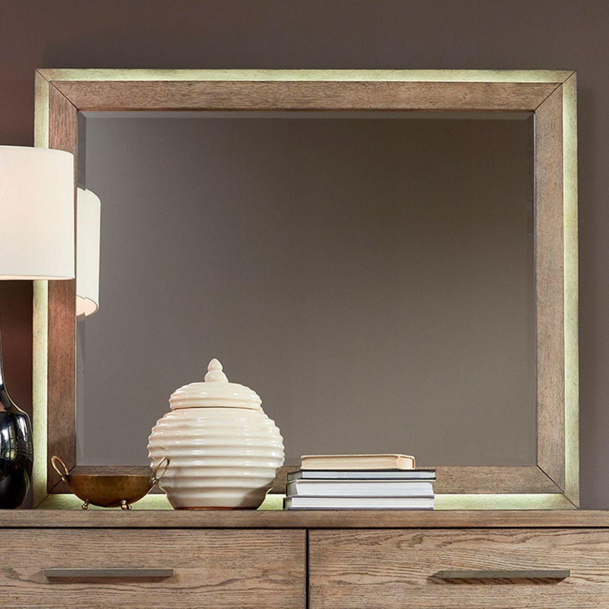 Casual contemporary living is bringing a new level of casual sophistication with the Canyon Road dresser and mirror. Crafted of rubberwood solids with reverse split heart white oak veneers, this set features a burnished beige finish with brushed brass bar pull hardware. The dresser has eight full extension drawers with felt lined top and cedar lined bottom drawers. The straight-lined contemporary styling flows nicely into a block foot. Attach the mirror with the included bolt-on supports that feature a floating panel design with inset warm LED three-way touch lighting, and a beveled edge. Express your personality without sacrificing style with this casual contemporary Canyon Road dresser and mirror.