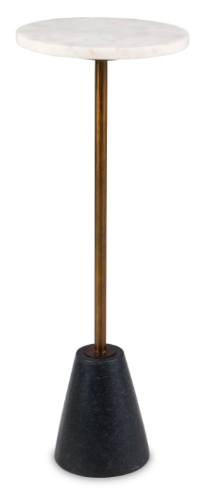 Marvel at the marbled mastery of the high-end Caramount accent table. Made of beautiful black and white marble, the round tabletop is supported by a sturdy goldtone pedestal on a white marble base. With a sleek, tapered profile, this space-saving table is striking from every angle.
