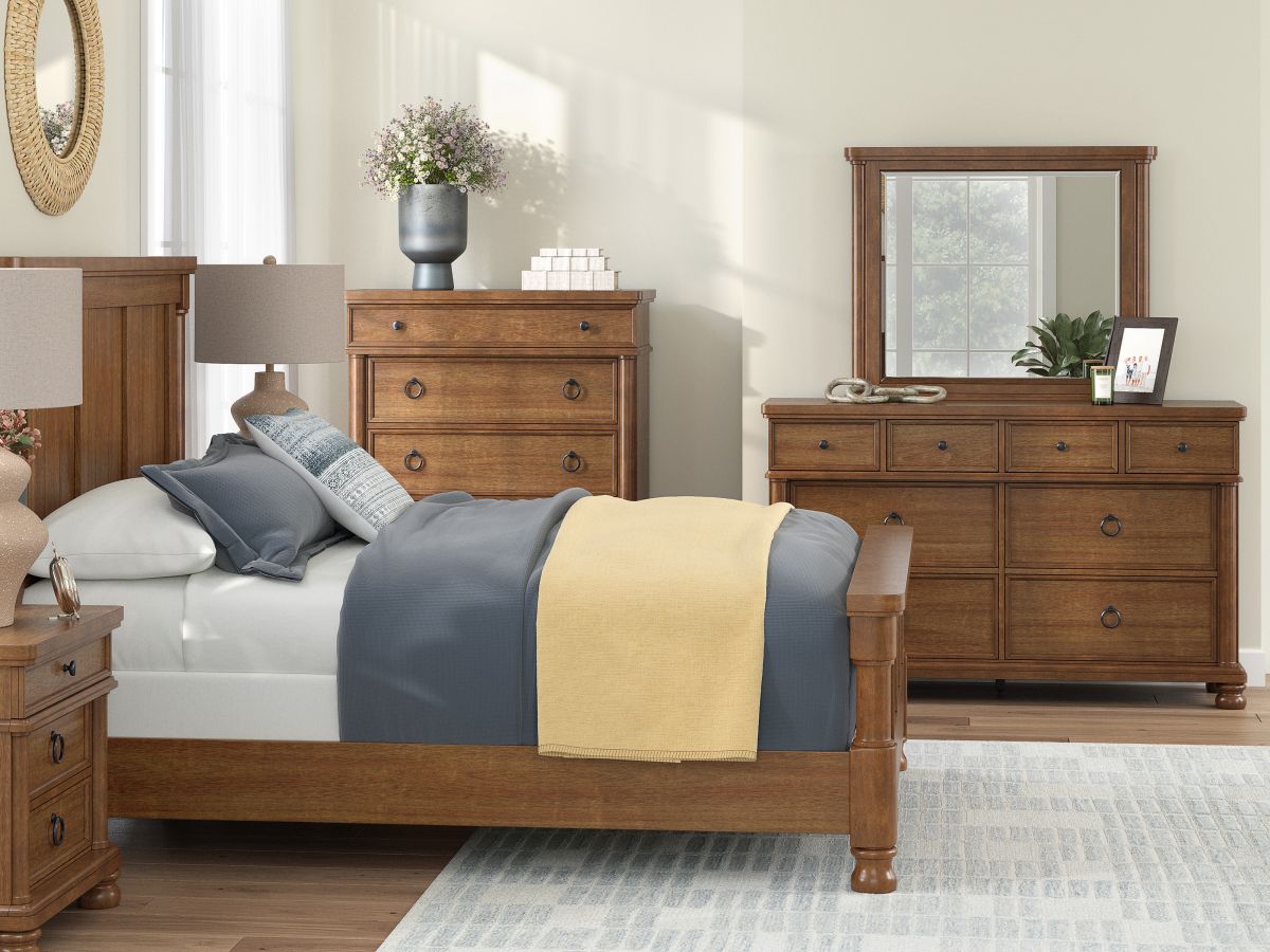 Casual traditional design meets a clean modern approach with the Chadworth Dresser in a medium brown finish.