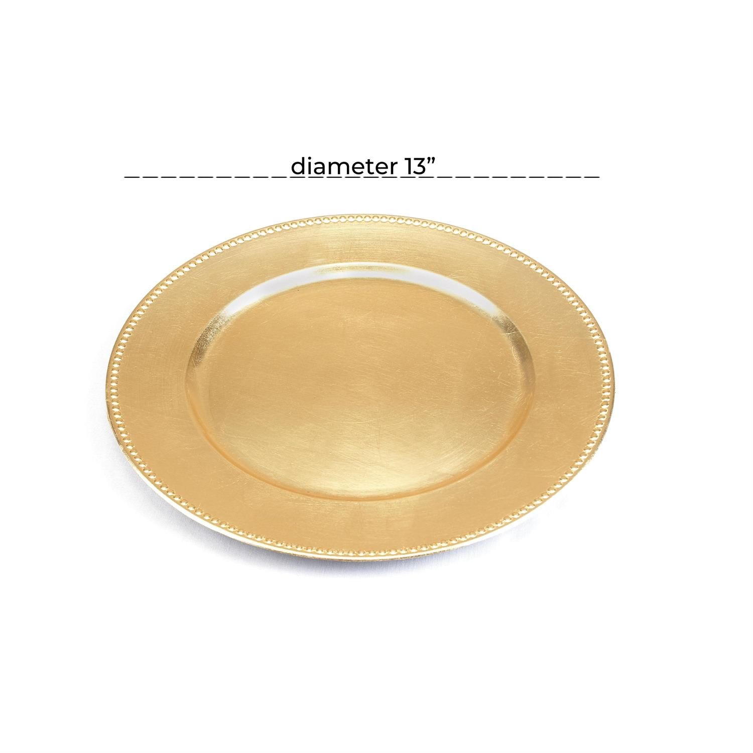 Indulge in the glamorous luxury of plush textures, dazzling details, and sleek finishes to elevate your home and add a sophisticated flair. Robust melamine construction material to ensures durability. Features a brushed gold finish with beaded edge. Features a polished round charger plate for display.