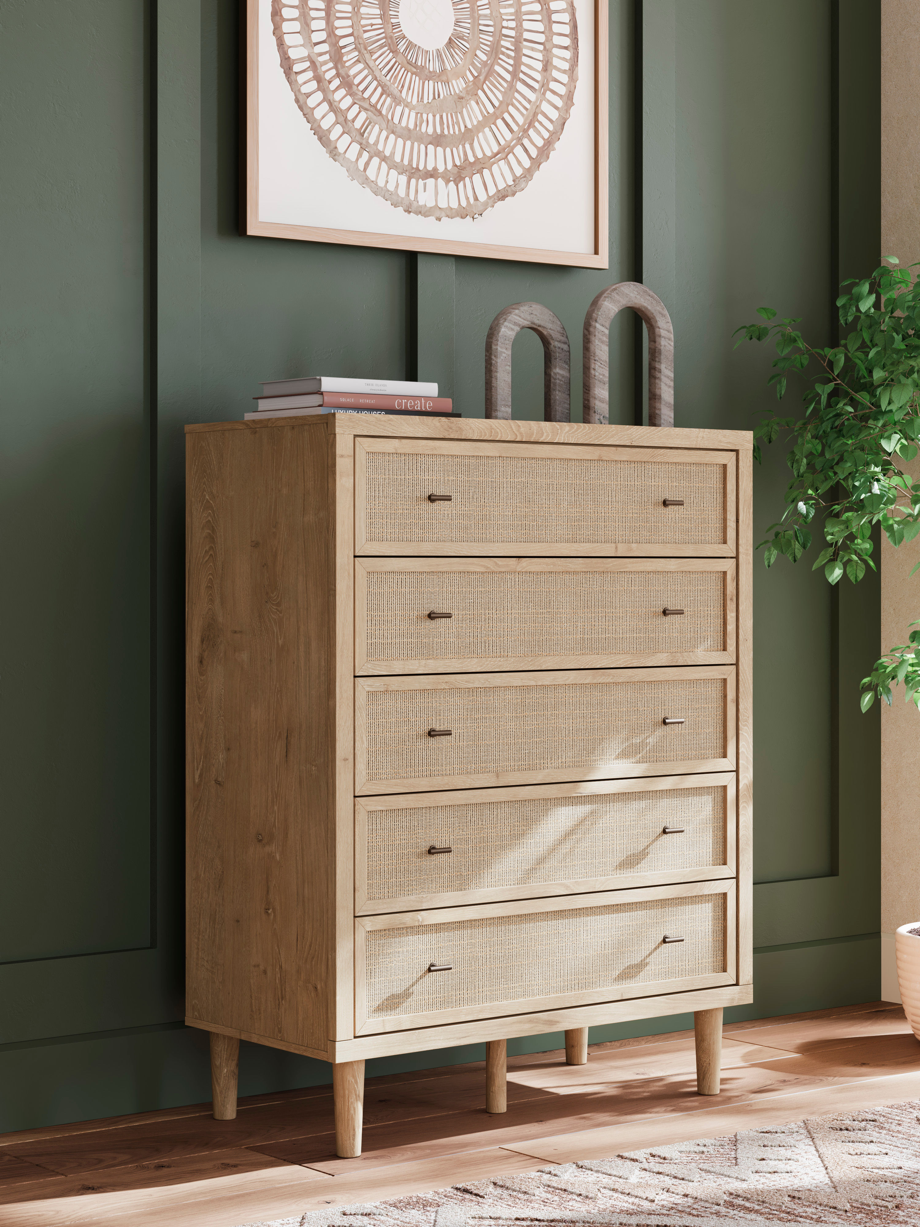 Clean-lined and contemporary—but far from stark—the Cielden chest of drawers is a fresh style awakening. Pairing a light finish with replicated oak grain and textured beige cane details, its mixed materials bring a naturally versatile vibe to your bedroom. Sleek, simple hardware plays perfectly with the modern aesthetic. Prepare to have your mind blown by the vast universe of possibilities that await within the spacious drawers.