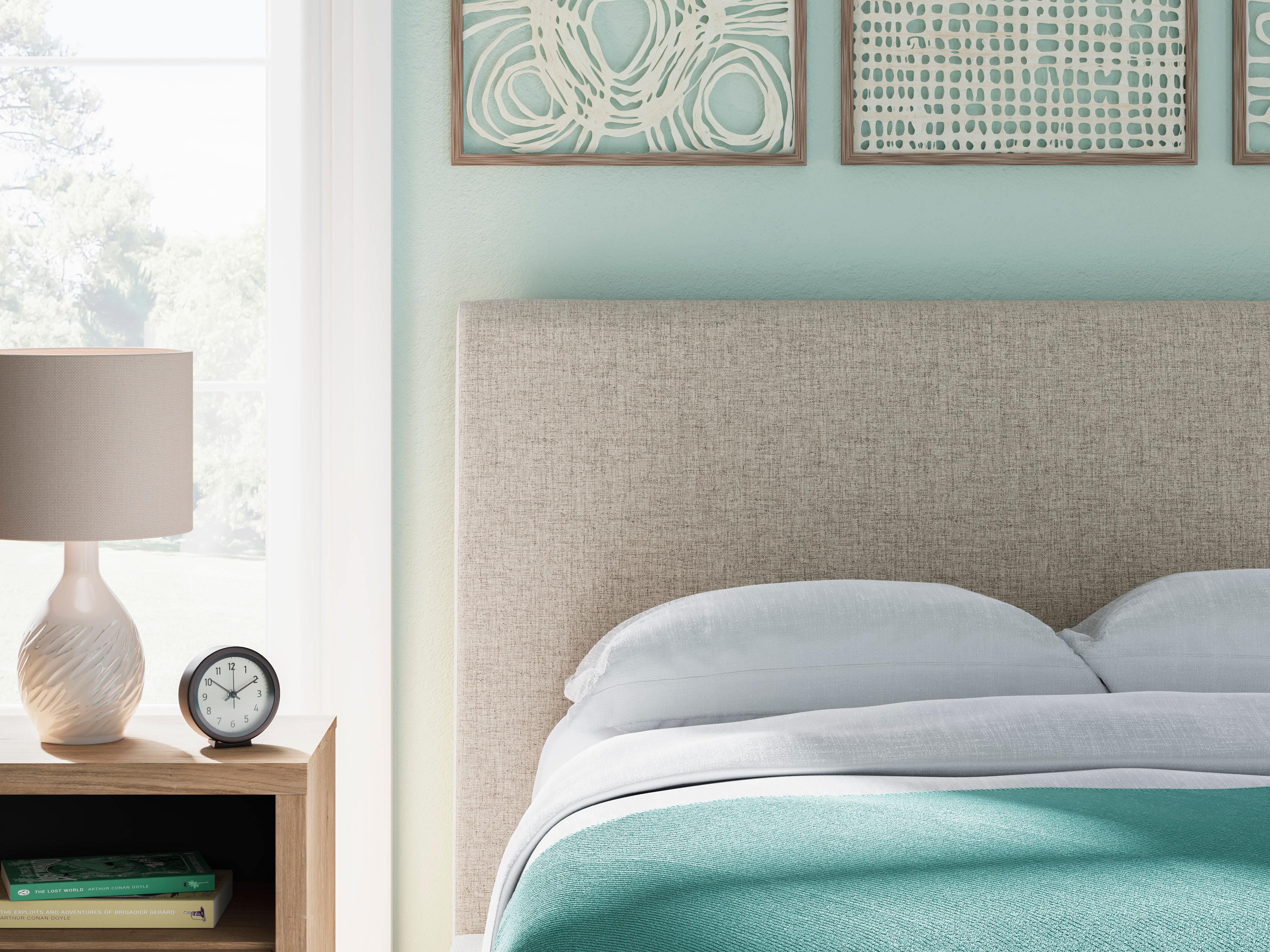 Embrace the clean-lined style of the Cielden full size bed, made with a light upholstery.