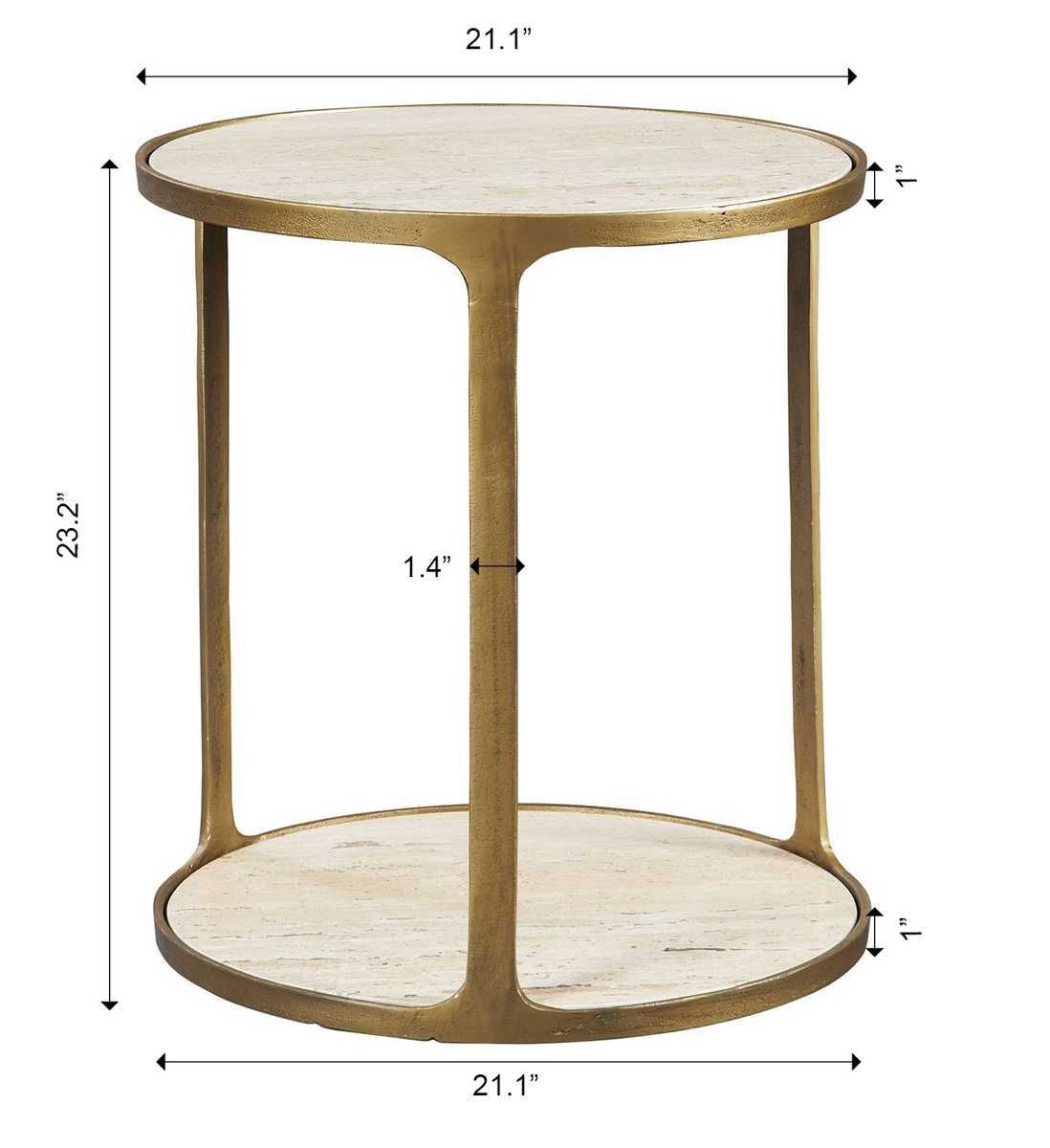 The warm tones of the Clench side table are the perfect accent to any modern space. With a rich antique brass cast aluminum framework accented by beige travertine shelves.