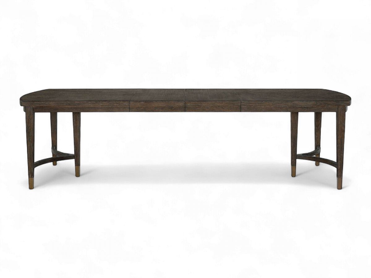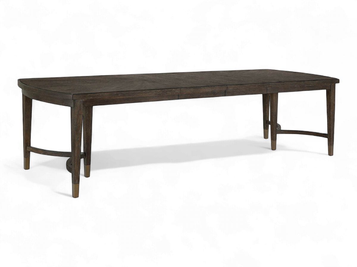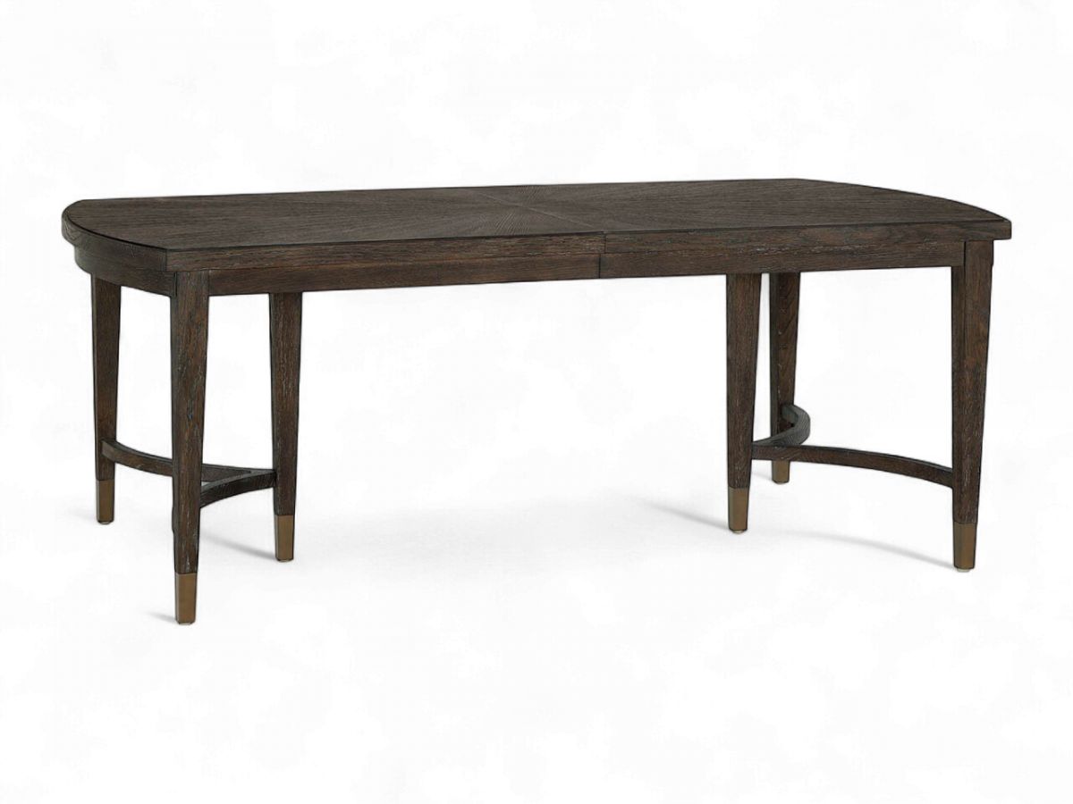 The Cocoa Dining Table showcases exceptional craftsmanship with rectangular form, gracefully rounded ends, and beautiful radial match veneer. The distinctive triple pedestal leg configuration with Smoked Gold metal ferrules creates airy elegance, while two 18-inch leaves accommodate both intimate and larger gatherings.