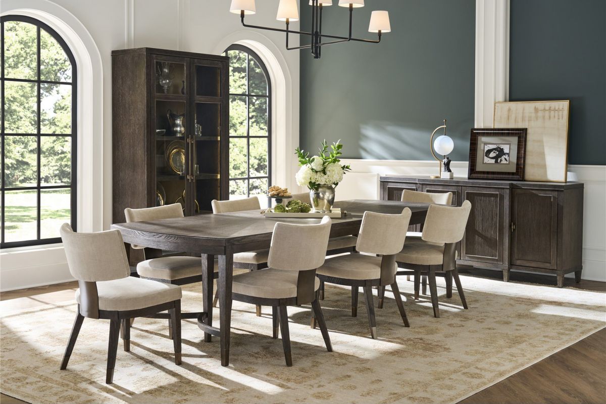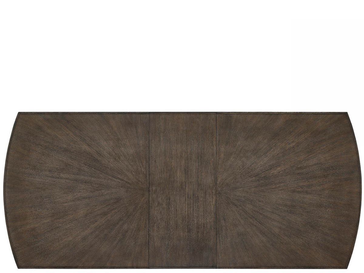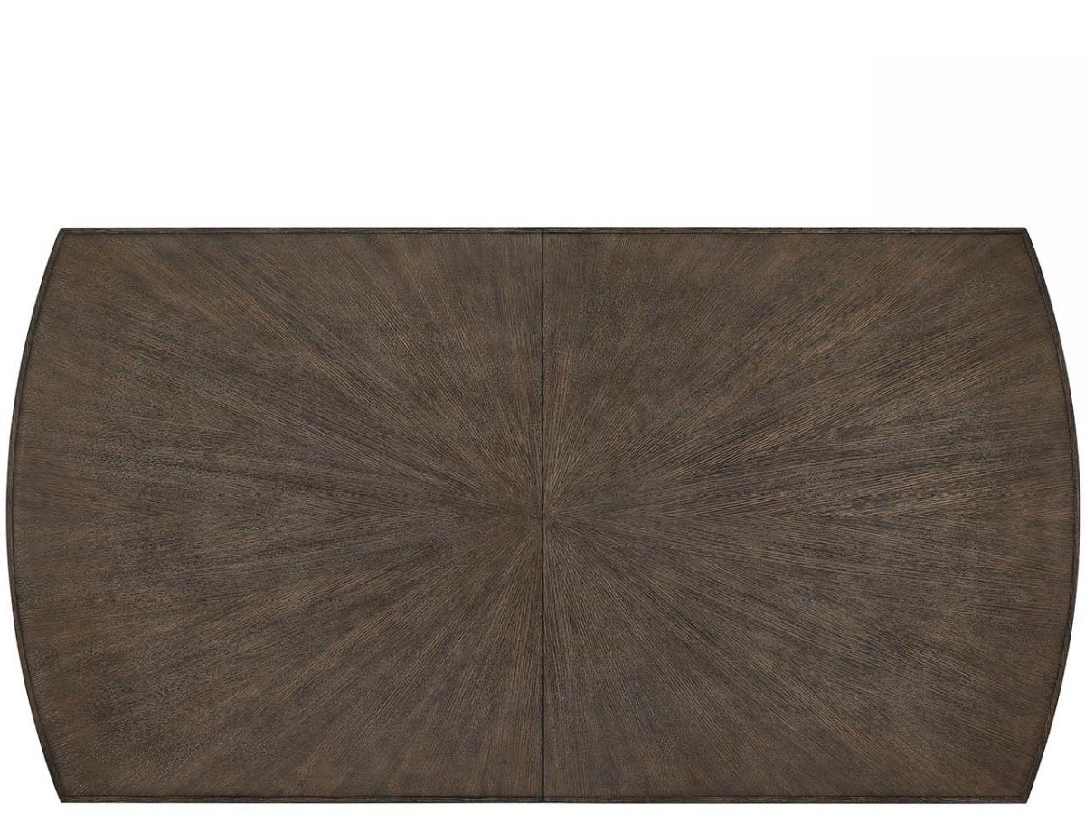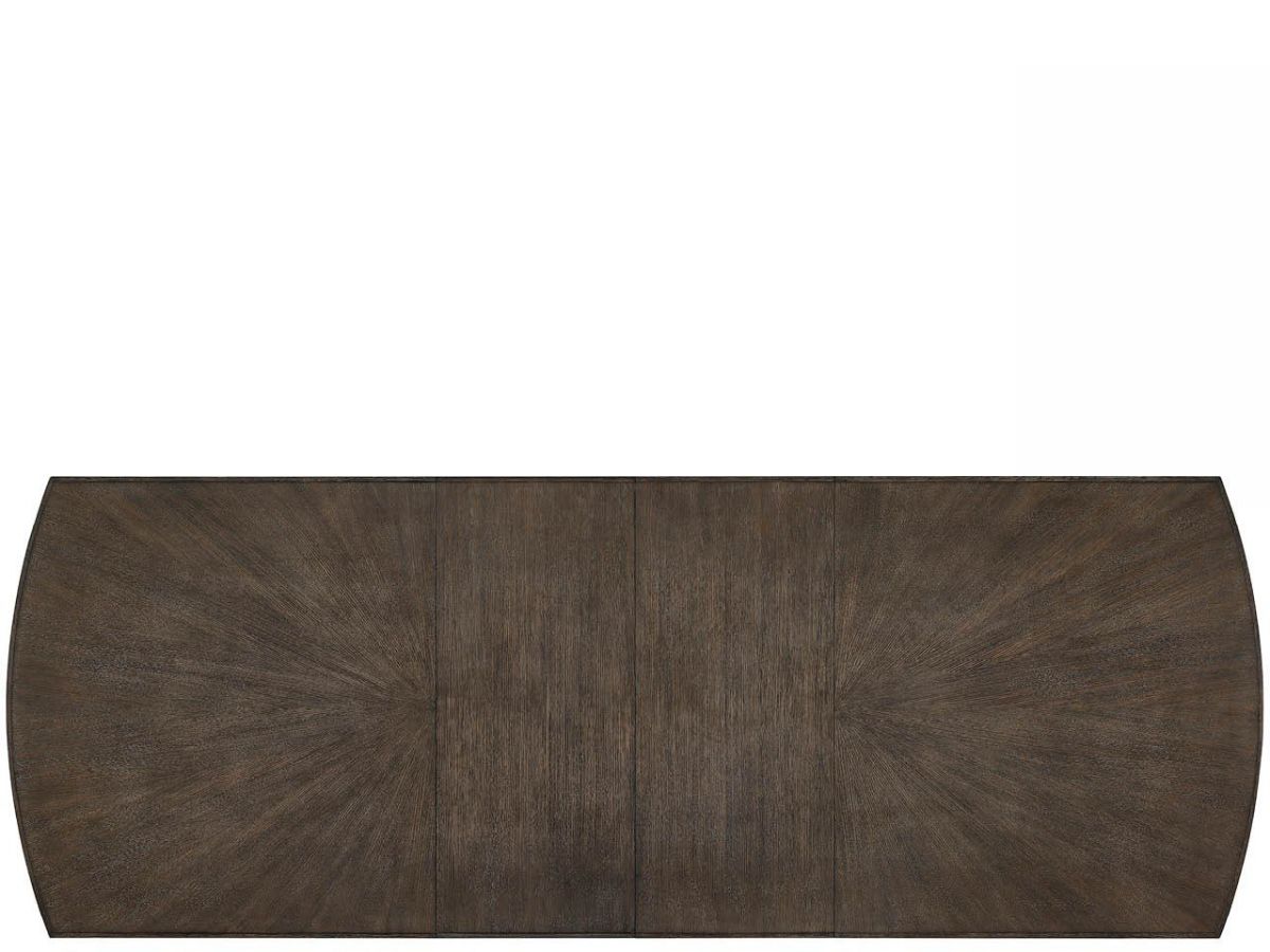 The Cocoa Dining Table showcases exceptional craftsmanship with rectangular form, gracefully rounded ends, and beautiful radial match veneer. The distinctive triple pedestal leg configuration with Smoked Gold metal ferrules creates airy elegance, while two 18-inch leaves accommodate both intimate and larger gatherings.