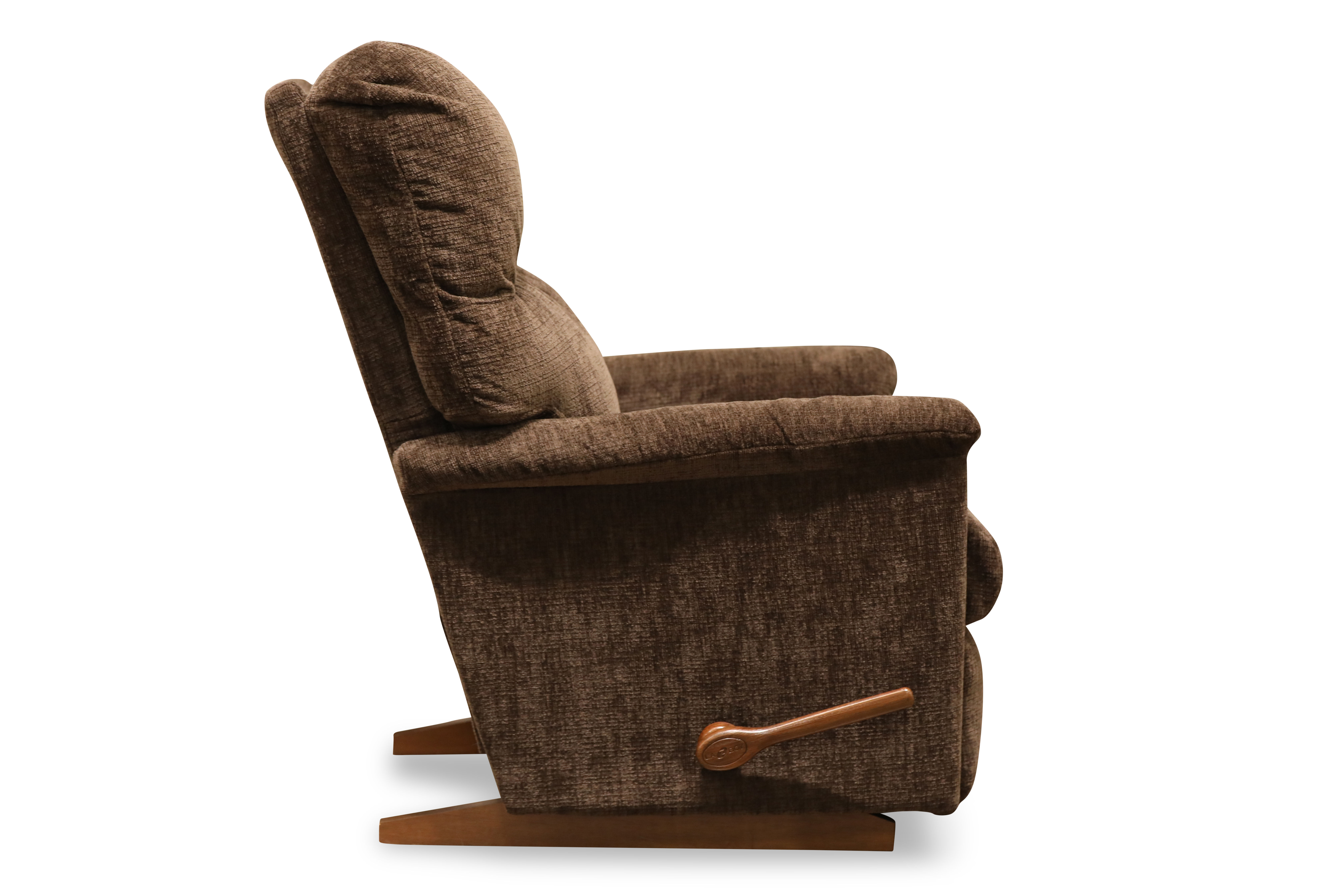 Our Collage Rocking Recliner is a family favorite that's easy to love. Its petite scale and updated style allow it to blend into just about any room. Collage features a bullnose (rounded edge) seat, padded flared arms and a decorative pull in the back cushion. Simply use the convenient handle on the outside arm to raise the legrest for reading, relaxing or watching TV.