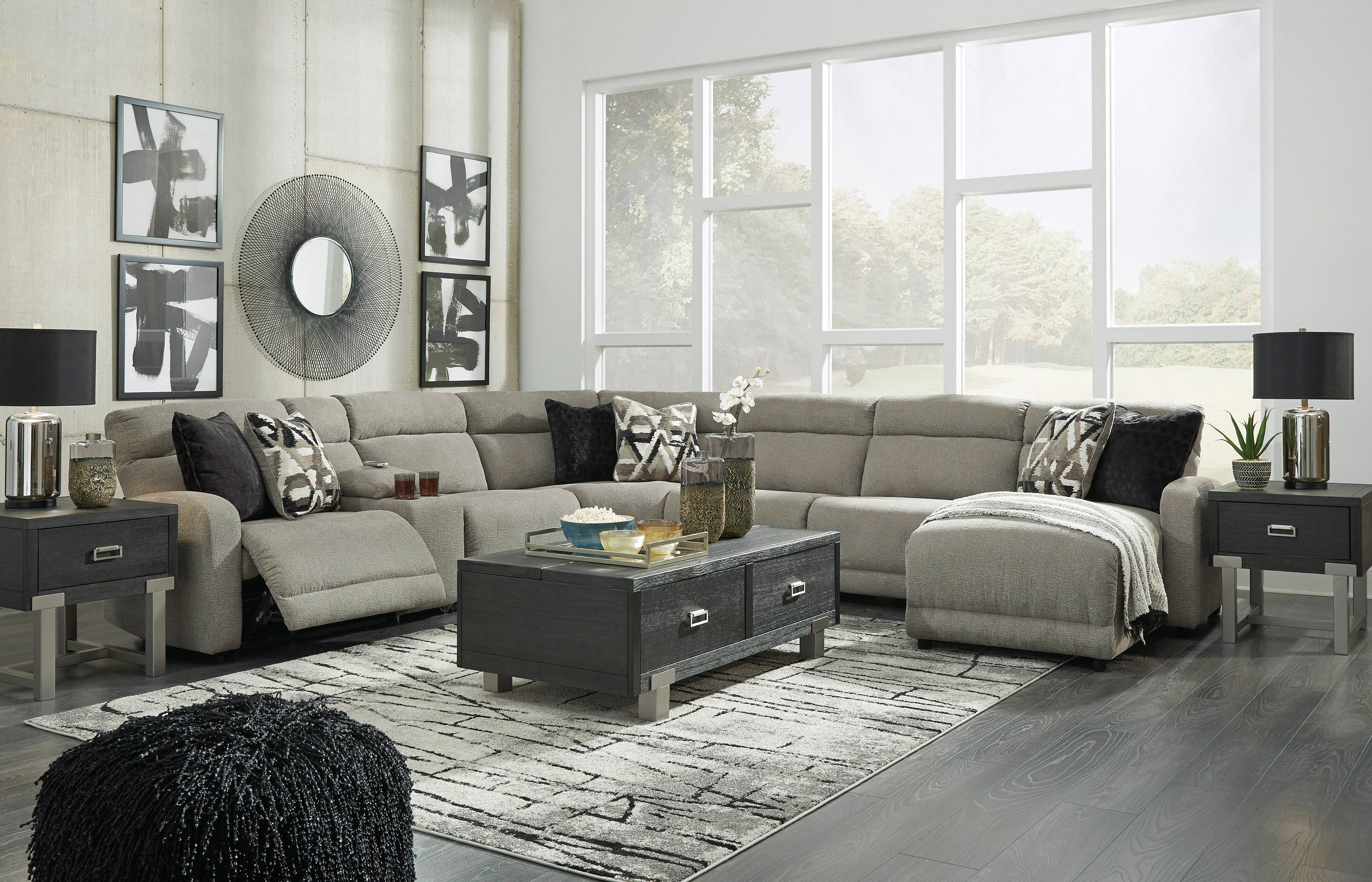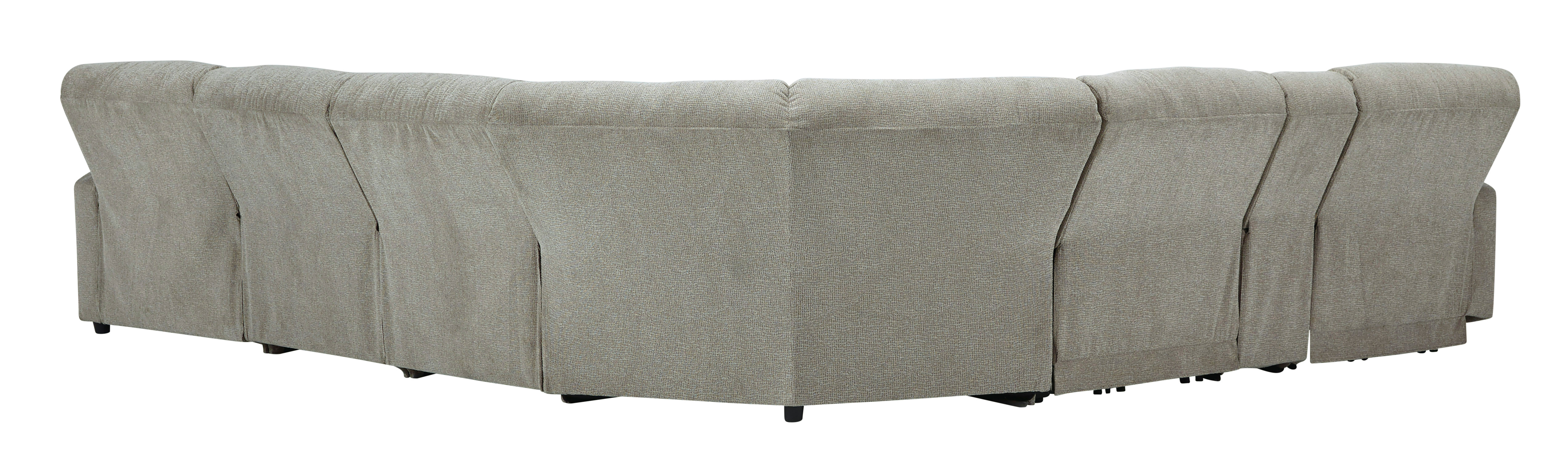 Discover modern comfort with this power-reclining sectional. Plush, stone-tone fabric for easy elegance.