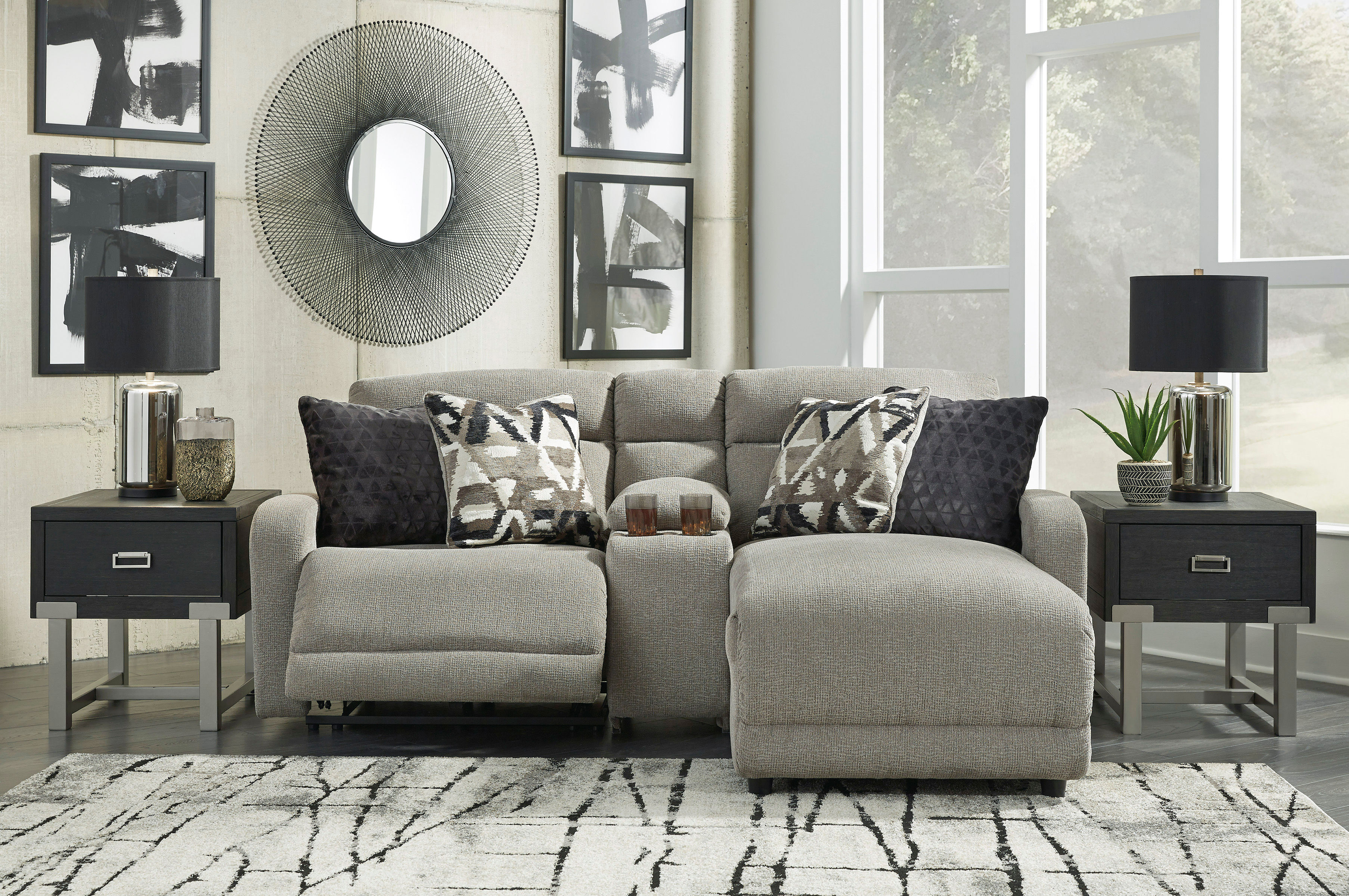 This modern power-reclining sectional has plush comfort with stone-tone fabric and one-touch power recline.