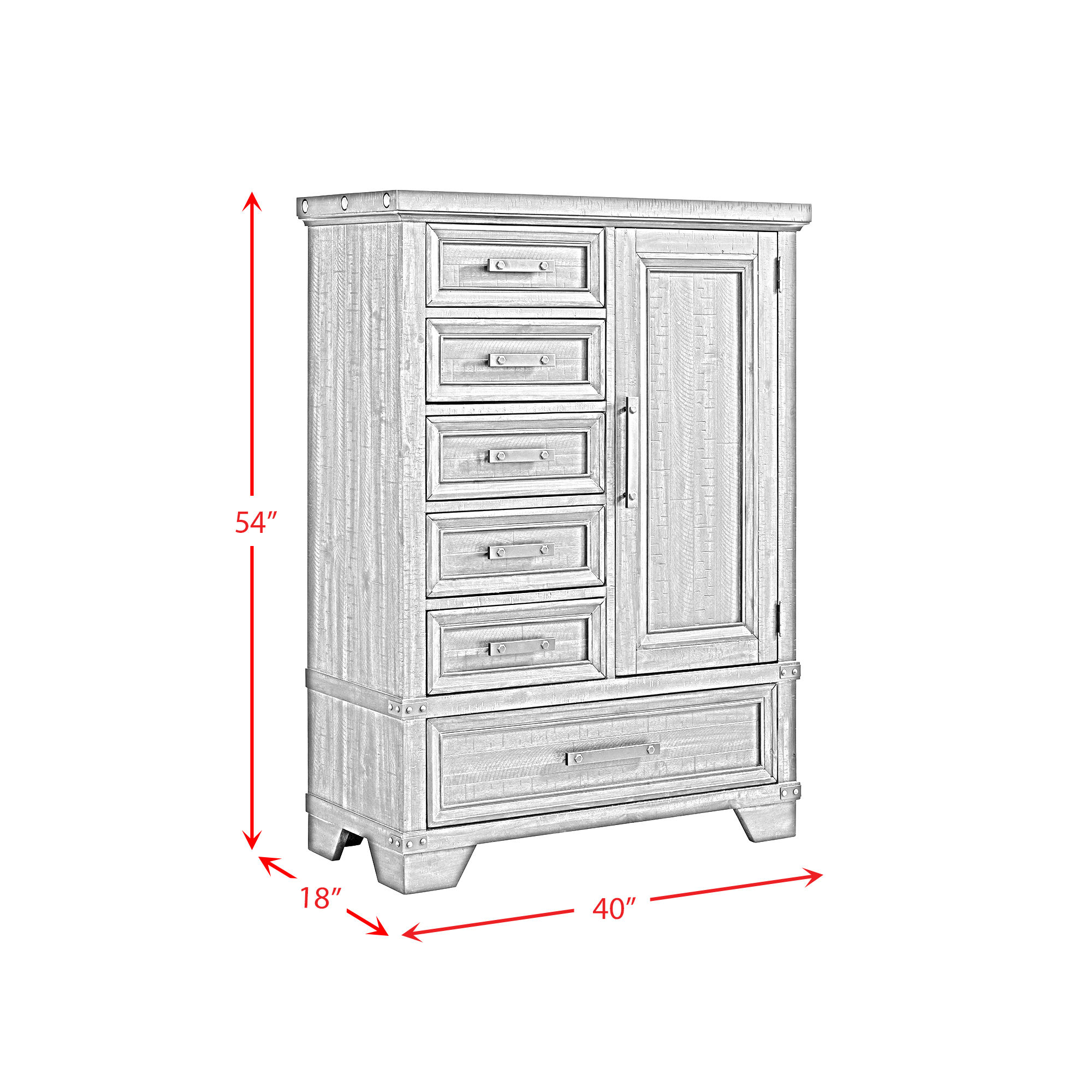 Rugged charm meets industrial styling with the Colorado City Door Chest. The dark wood finish and the black metal hardware adds to the industrial design of this chest. Featuring 6 drawers and a door cabinet, this door chest will have ample storage space for your wardrobe.