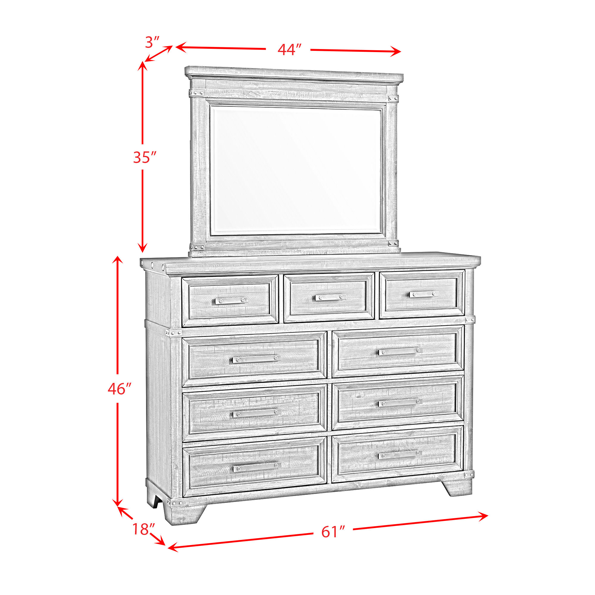 Rugged charm meets industrial styling with the Colorado City dresser and mirror set. The dark wood finish and the black metal hardware adds to the industrial design of this mirrored dresser. Featuring 9 drawers, this stunning mirrored dresser will have ample storage space for your wardrobe.