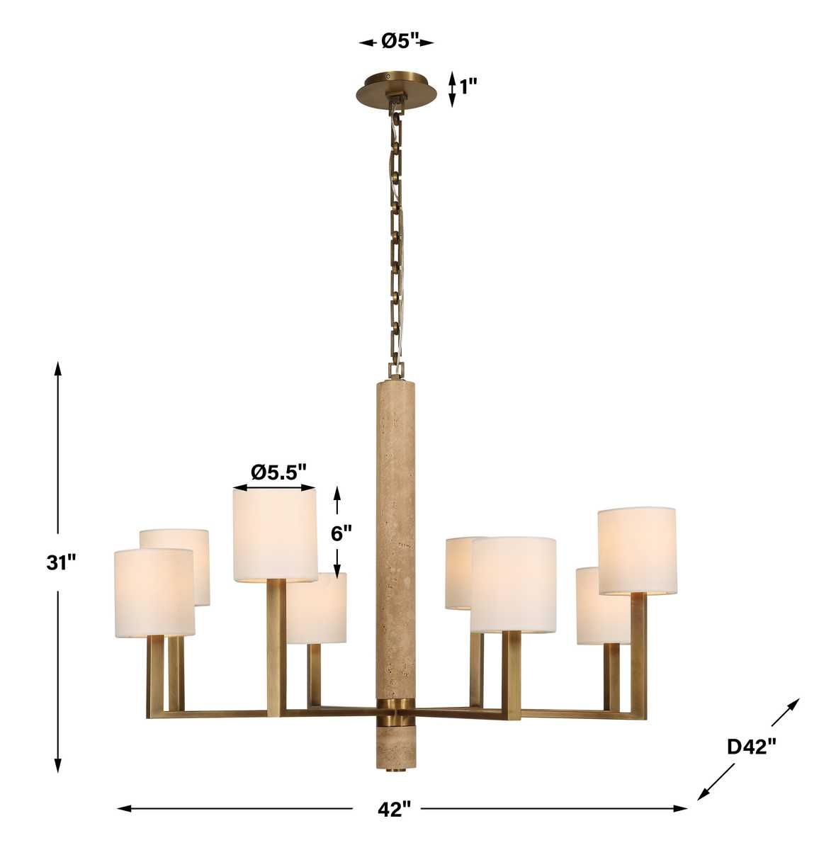 Is it still modern and minimalist when the details are this extravagant? A slender beige travertine column centers eight angular arms with lights of alternating heights. Each is topped by a round off-white linen hardback shade to cast a clean, flattering, diffused glow. Metal hardware sports a light antique brass finish and includes a chain of hand-formed rectangular rings. 8-60 watt max candelabra sockets. Bulbs not included. Supplied with 20' wire, 7' chain for adjustable installation.