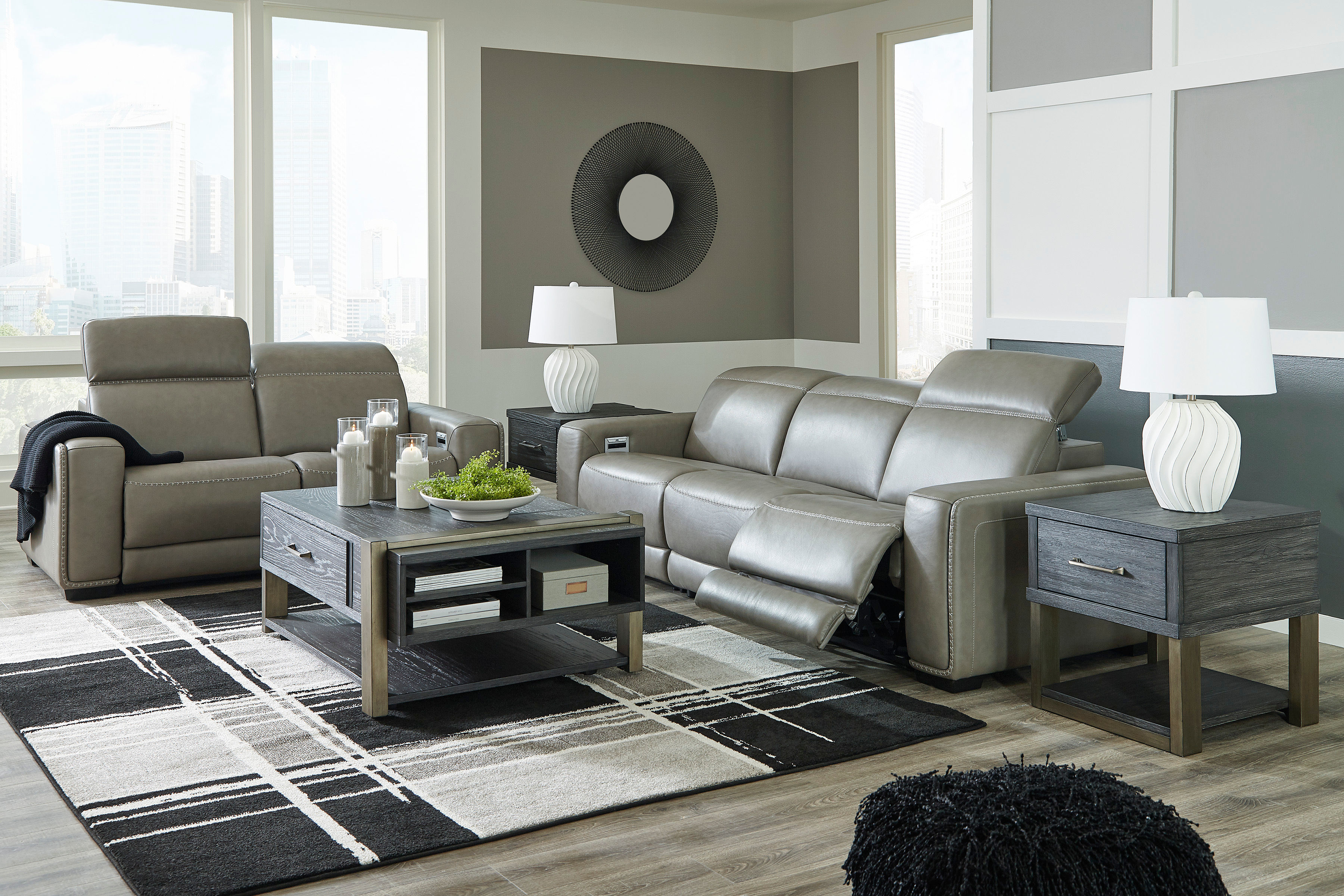 The Correze power-reclining loveseat is high-design meets comfort with the gray faux leather upholstery.