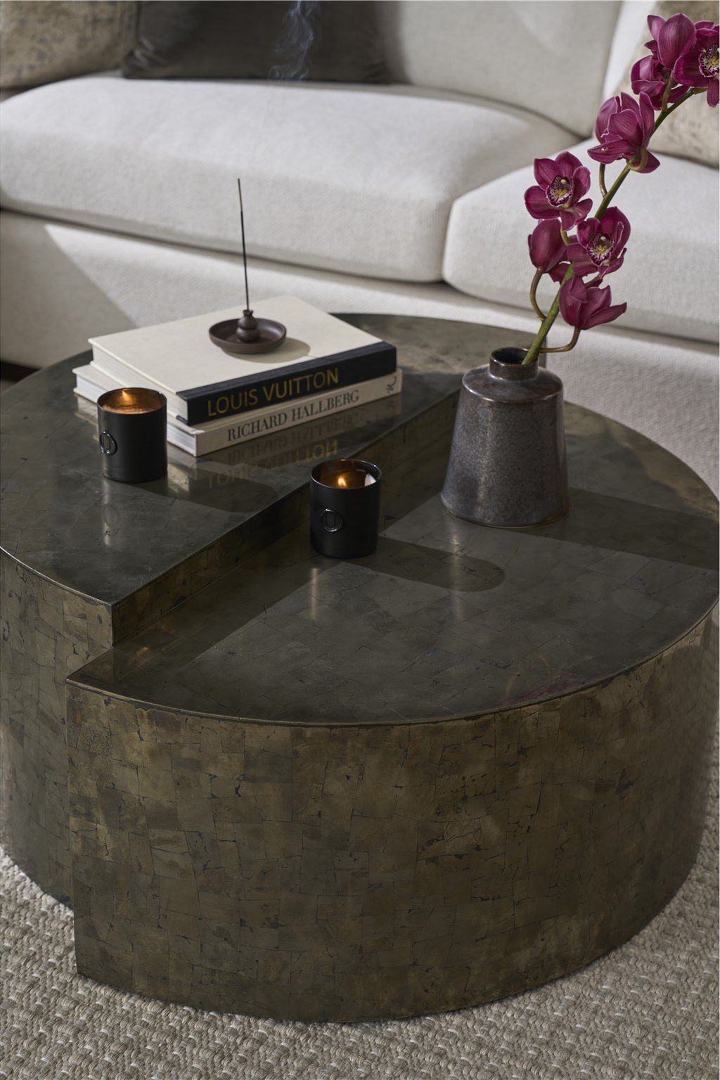The Cosmo Cocktail Table makes a bold statement in any living space. Its unique, geometric design showcases the natural shimmer of pyrite, creating a captivating centerpiece that's both stylish and functional.