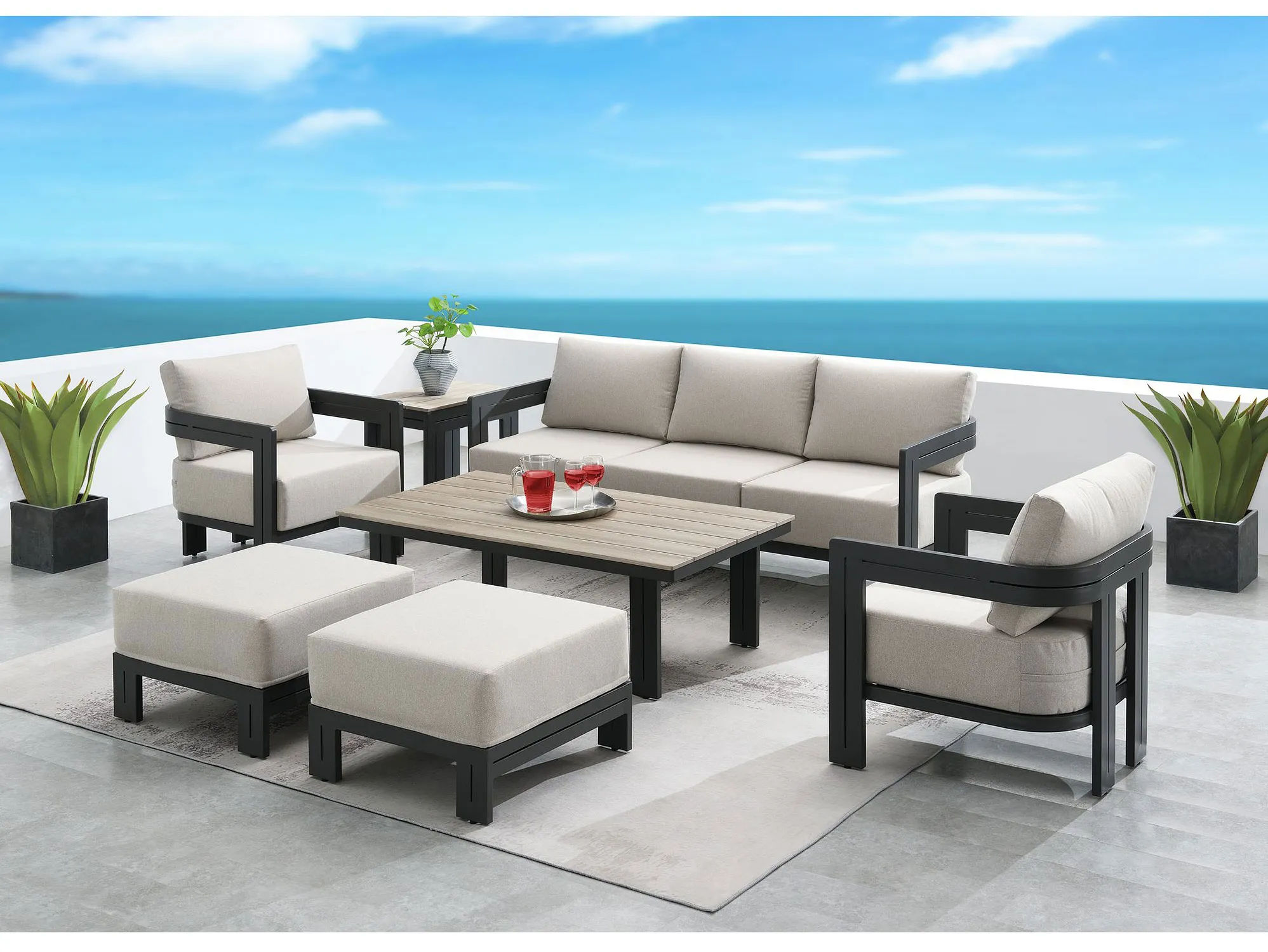 Experience comfort and style with this outdoor chair, the Costa outdoor chair is made with black frames that accentuate the light colored upholstery. This outdoor chair from Elements will elevate any outdoor space and bring a contemporary style.
