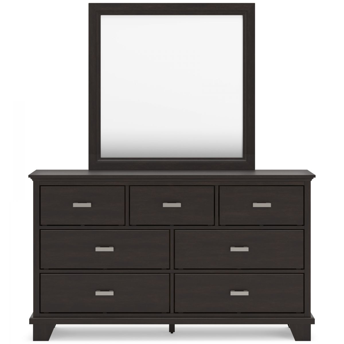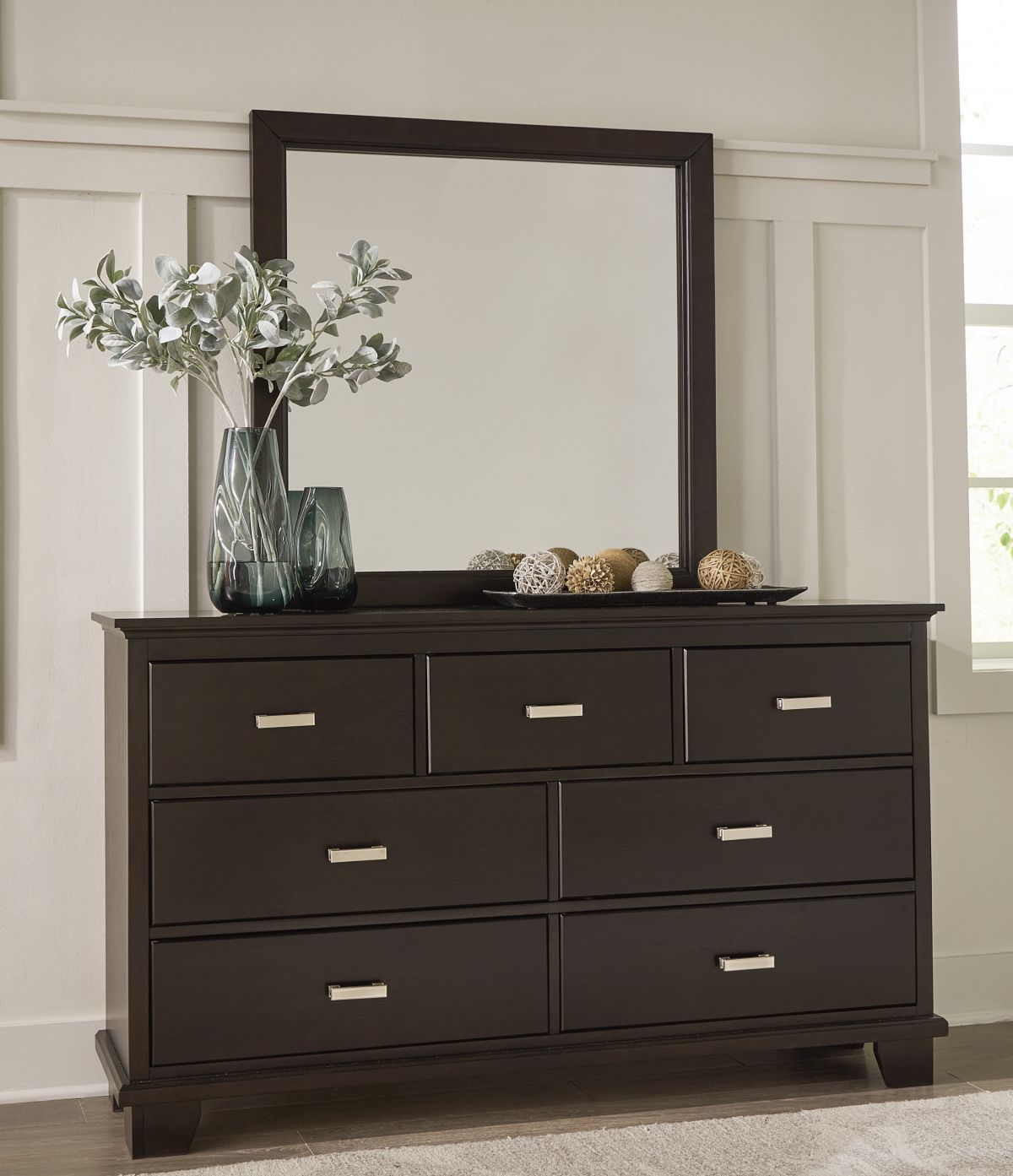 Feast your eyes on the richly versatile Covetown dresser with mirror. Its traditional-inspired dark brown finish effortlessly blends with contemporary bright nickel-tone pulls to create a stunning look that's not too stuffy or too trendy. Spacious drawers offer plenty of storage for your wardrobe and spare bed linens. The mirror is a handsome reflection of classic-meets-modern design.