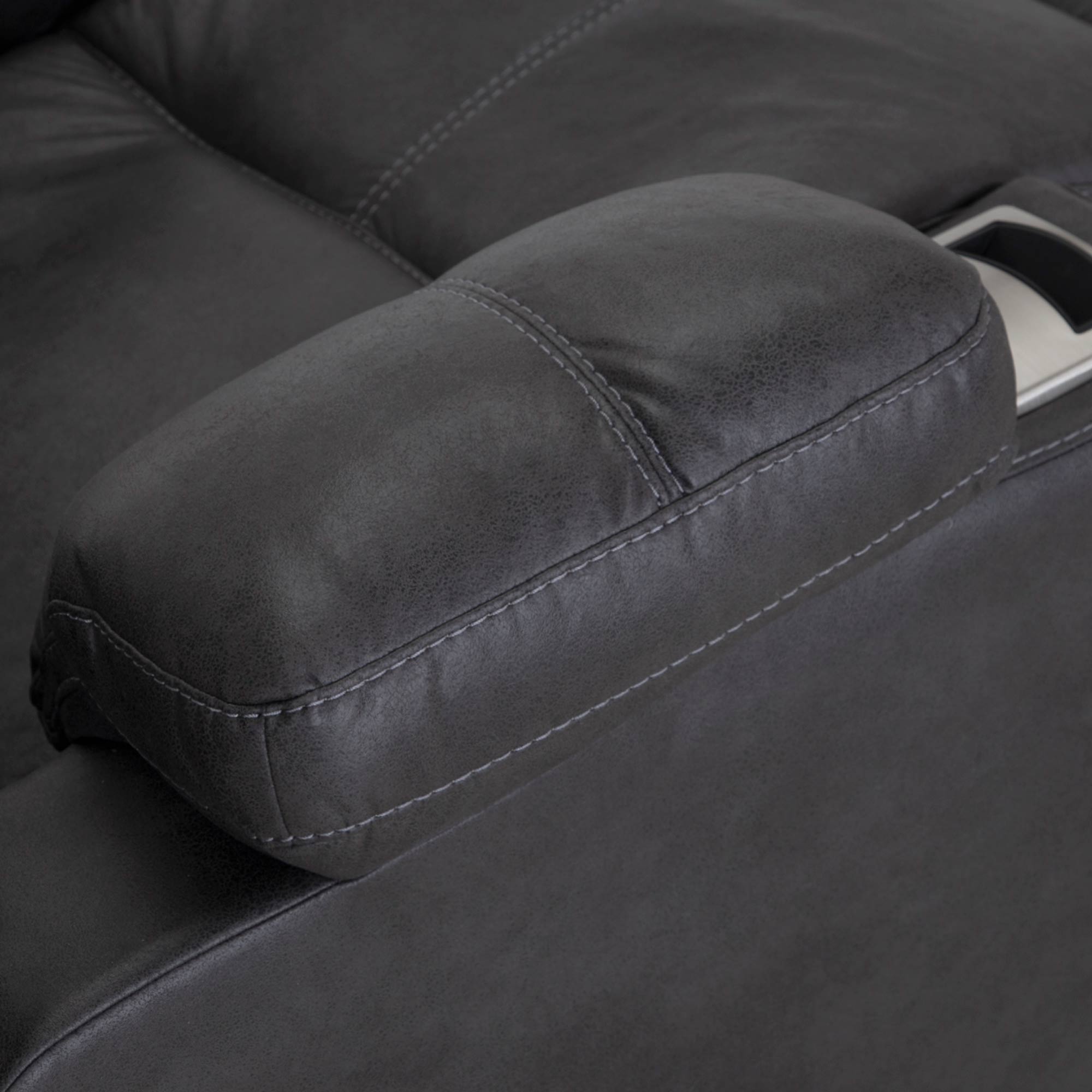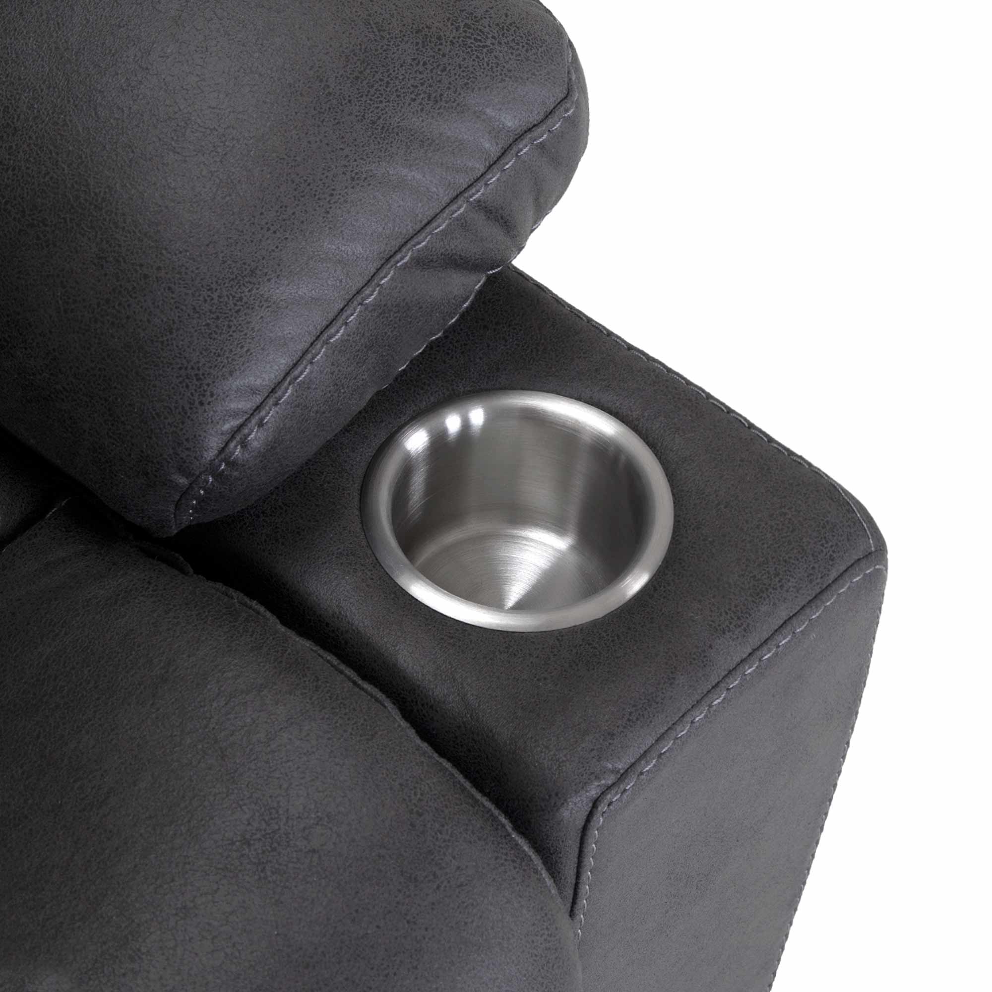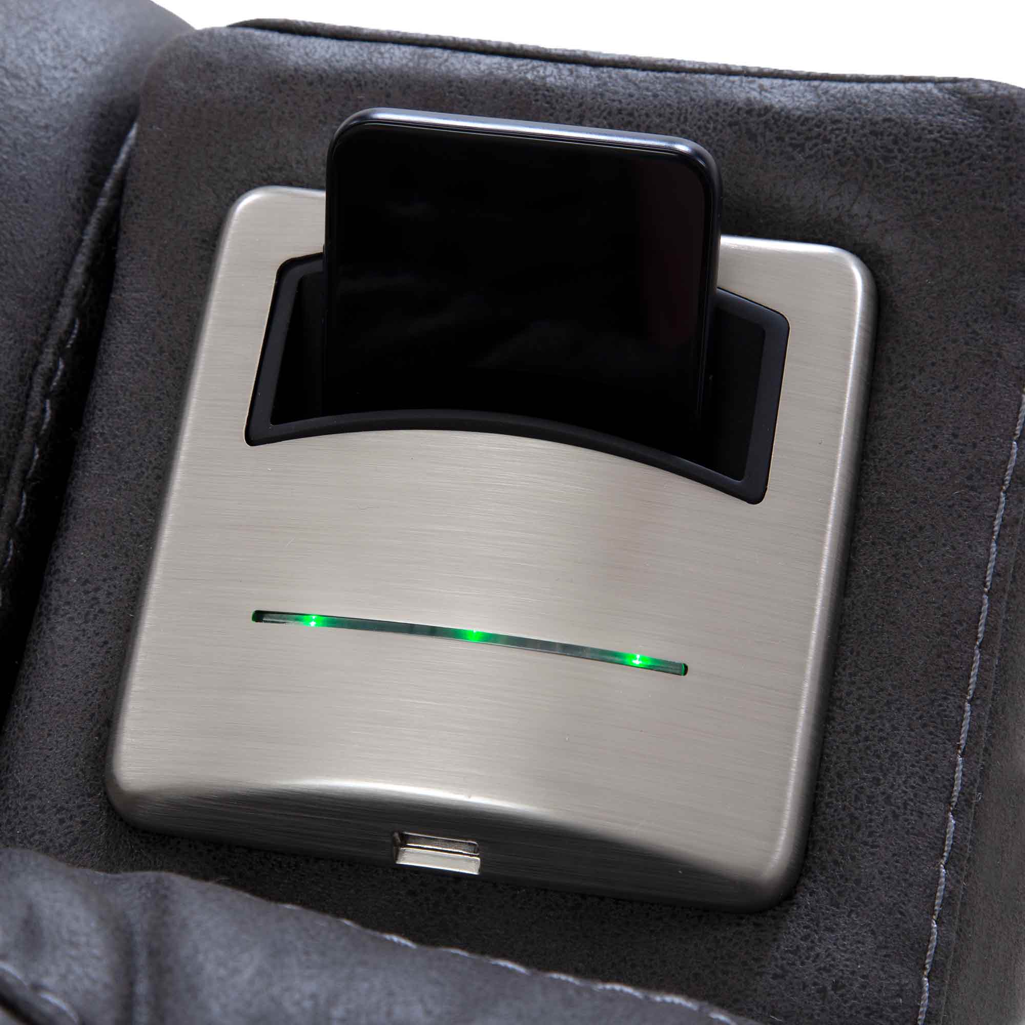 The Cranden rocker recliner comes standard with wireless slot charging, a USB charging port, and a stainless steel cupholder. This manual recliner is upholstered in a 100% polyester fabric.