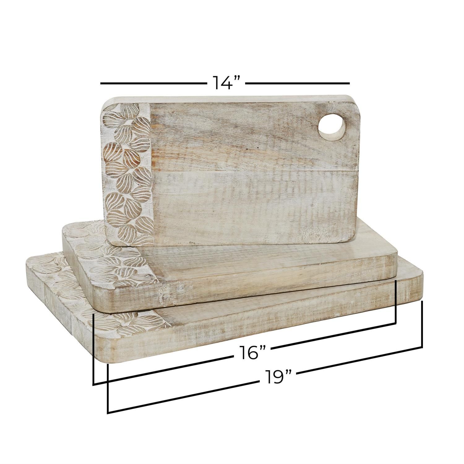 Crafted to offer any country cottage themed home a final touch, with an elegant rustic appeal. Crafted with solid mango wood for durable forms. Whitewashed natural wood brown finish highlights this cutting board set. A medley of natural wood graining pattern and delicate caved details gives these kitchen decor a chic and laid back design.