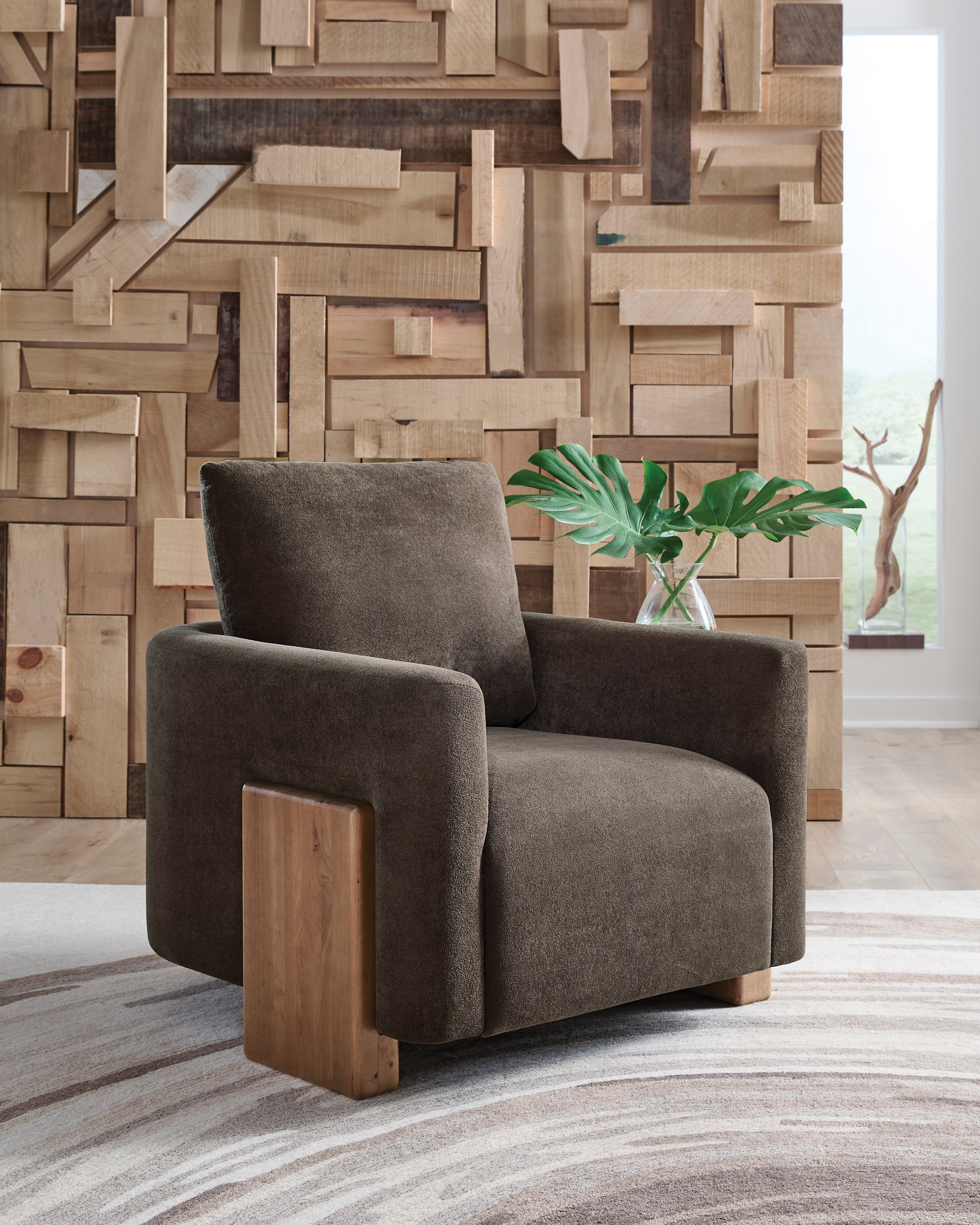 Cozy comfort meets modern design. This accent chair invites you to sink into its plush chocolate brown fabric. Substantial solid wood block legs with a natural finish infuse contemporary flair into your living area, bedroom or home office. And yay, it arrives fully assembled.