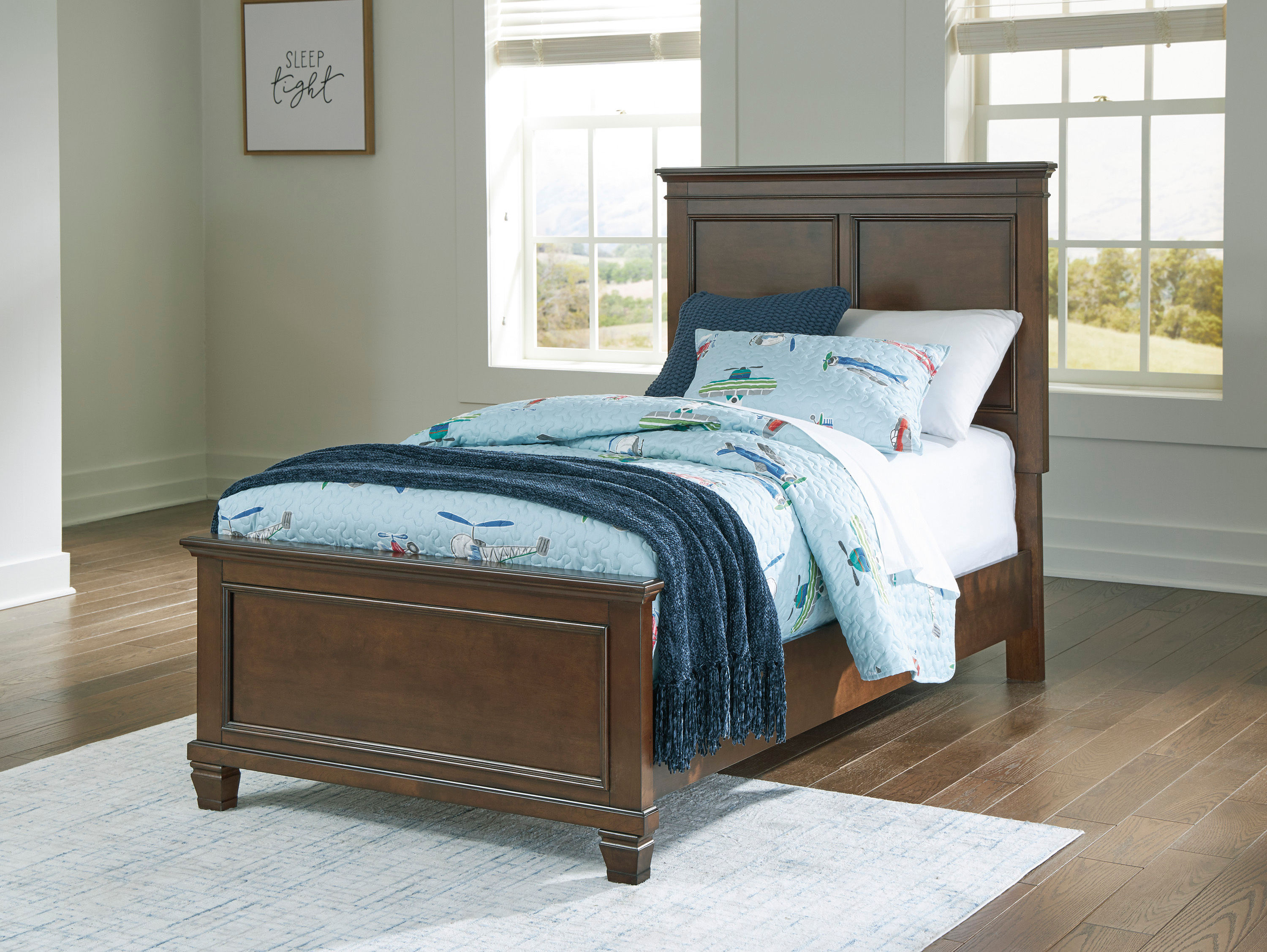 • Includes twin panel headboard, footboard and rails