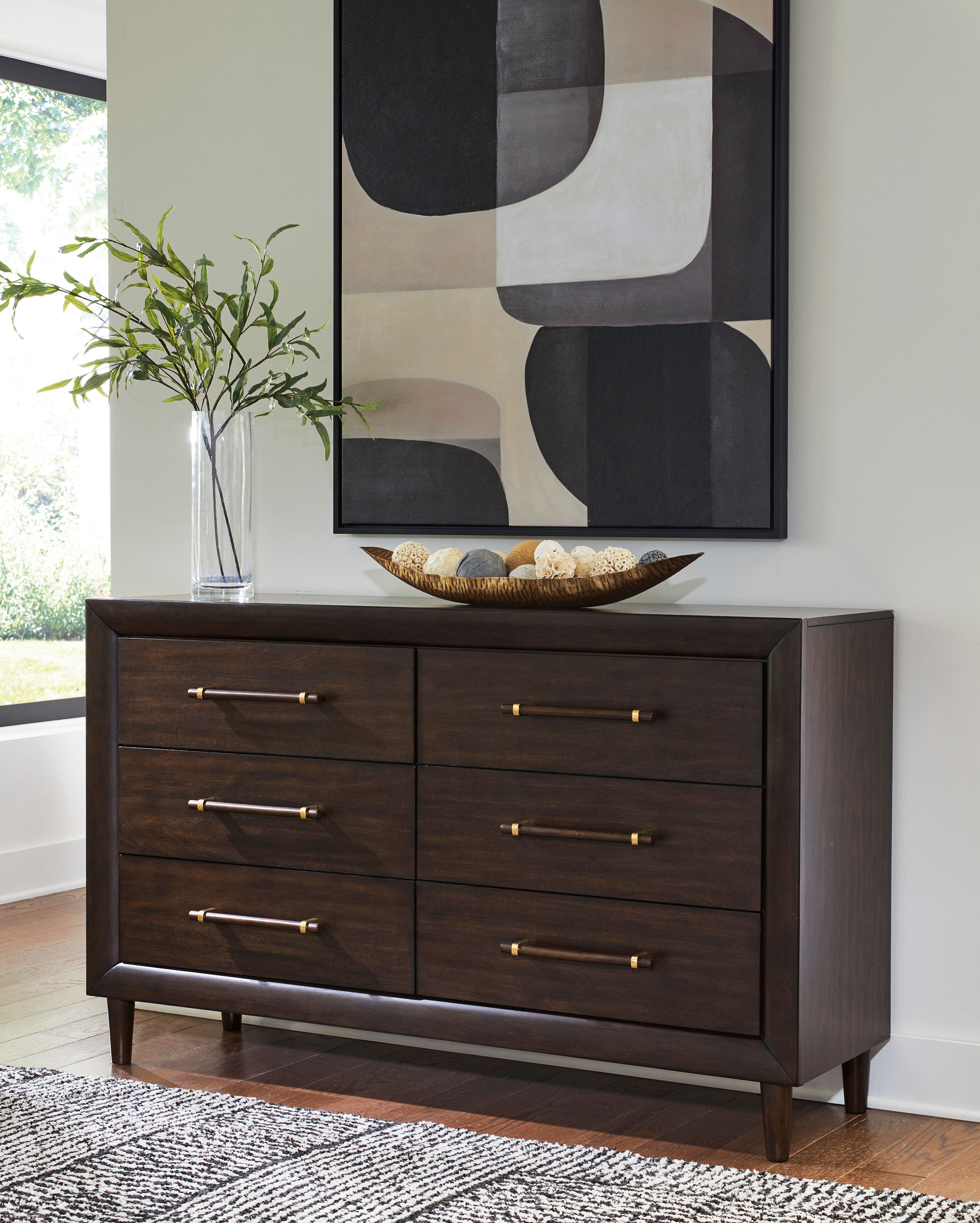 This dresser with mirror is perfect for contemporary or mid-century interiors. Its rich merlot finish exudes a chic metropolitan vibe. The drawers, designed with exquisite framing and elongated wooden pulls, enhance the overall aesthetic. Whether you want to refresh your entire bedroom or add a few key pieces, this is the ideal choice.