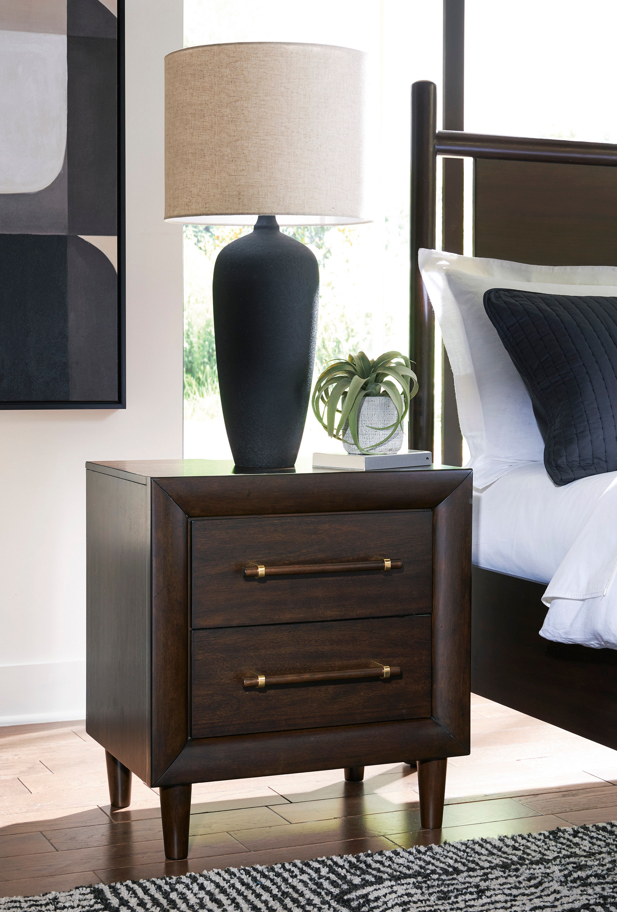 This nightstand is perfect for contemporary or mid-century interiors. Its rich merlot finish exudes a chic metropolitan vibe. The drawers, designed with exquisite framing and elongated wooden pulls, enhance the overall aesthetic, while USB charging keeps you connected. Whether you want to refresh your entire bedroom or add a few key pieces, this is the ideal choice.