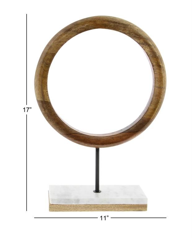 Embrace artistic expression with a style that highlights bold designs with sleek lines, neutral elements, and a minimalist aesthetic. Brown decorative sculpture is skillfully crafted from a harmonious blend of luxurious marble, robust iron, and rich mango wood, creating a timeless piece. Round decorative statue is boasts matte golden-brown hues on the wood ring, complemented by a black metal post and white marble with subtle light gray veining. Mango wood sculpture features a brown wooded 'O' nestled in a black metal stand with a white marble base, elevating the aesthetic of any room.