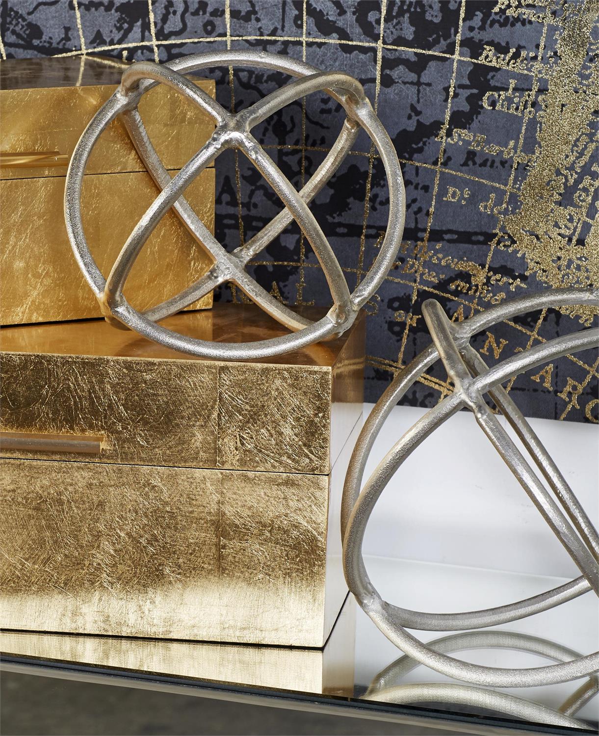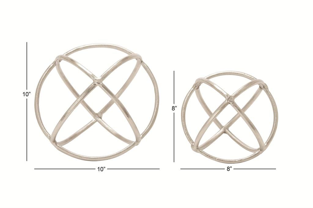 Inspired by sleek elegance and clean lines, a minimalistic design offers effortless luxury with monochromatic tones and bold, angular structures. This features an orb set made of aluminum and crafted in India. Modernized decorative set which features a metallic silver finished atom style orb with overlapping two spheres caged by a large circle. Two metal orbs forming planetary ring-like silhouettes are featured in this set.
