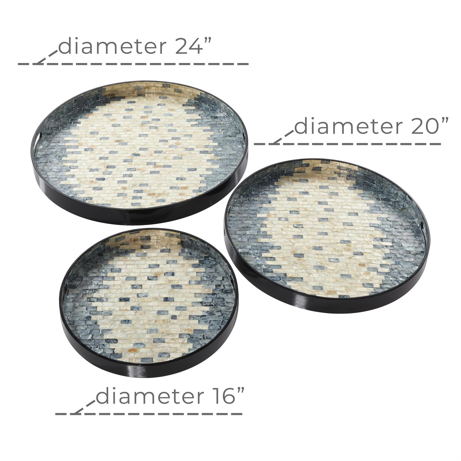 Inspired by blissful serenity and the allure of the sea, where soothing hues and natural textures bring effortless charm to the home. Blue living room decor tray set is crafted with MDF and Capiz shell for an exquisite touch. Round decorative tray set showcases a polished smokey blue finish inlay with beautifully contrasted with beige hues, and sleek black frame. Boasting a bricked Capiz pattern on the inner tray and a matte black wooden base with handles, this mother of pearl set of 3 trays offers a unique coastal vibe.