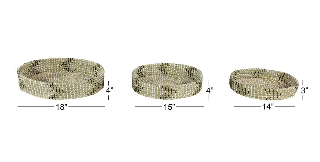 • This set of round decorative trays showcase a captivating natural seagrass-woven tray basket design