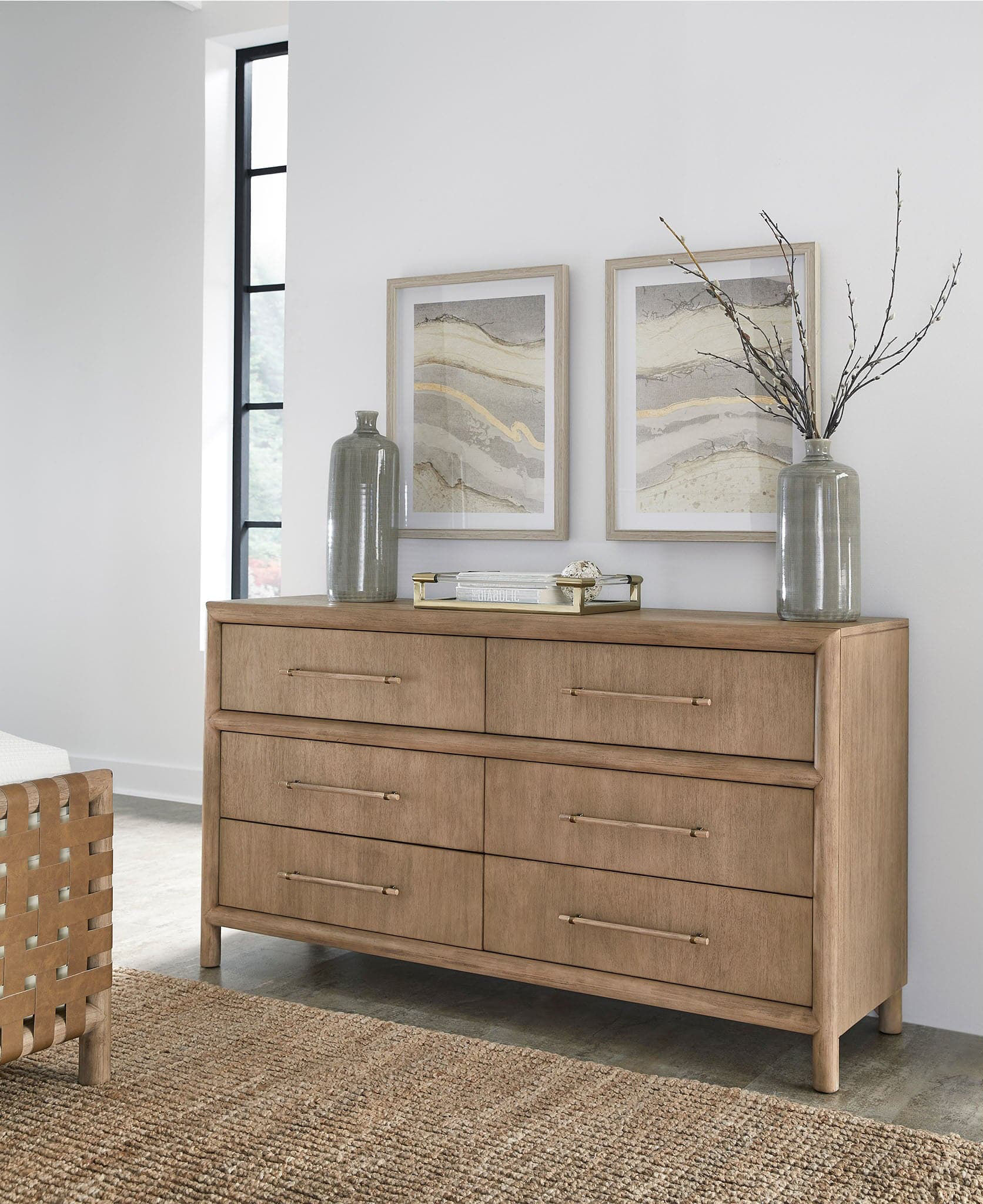 Update your bedroom with the modern Dorsey dresser with a light and natural finish.